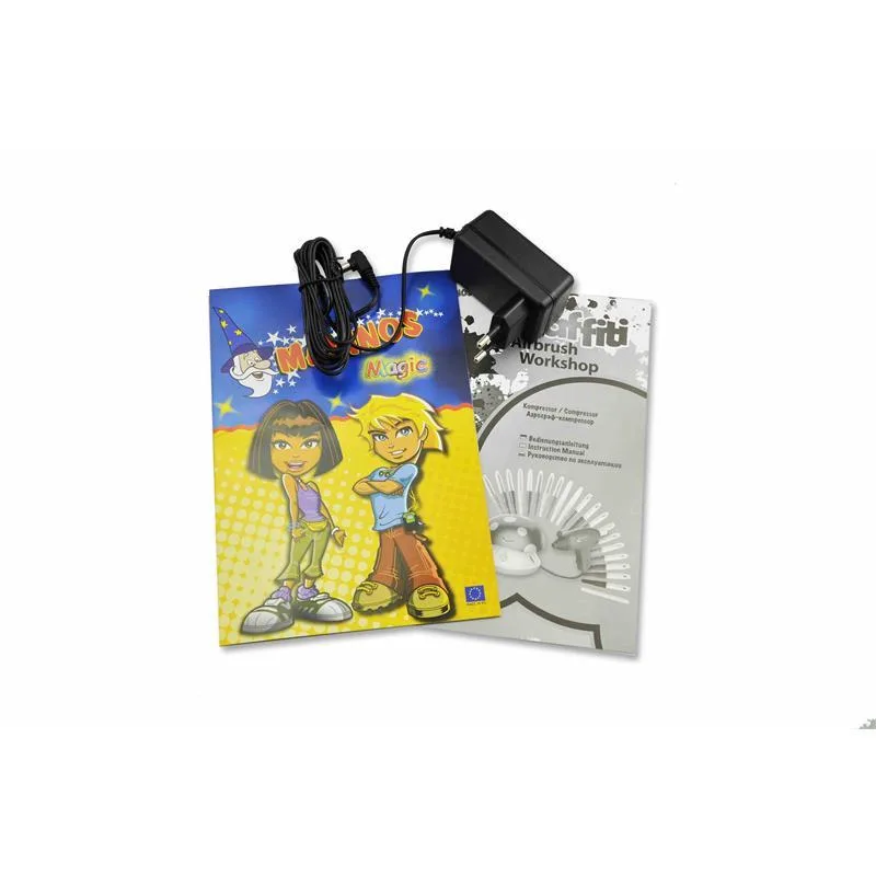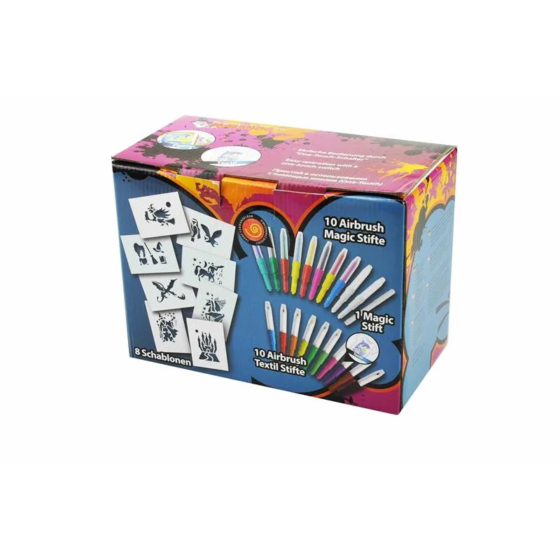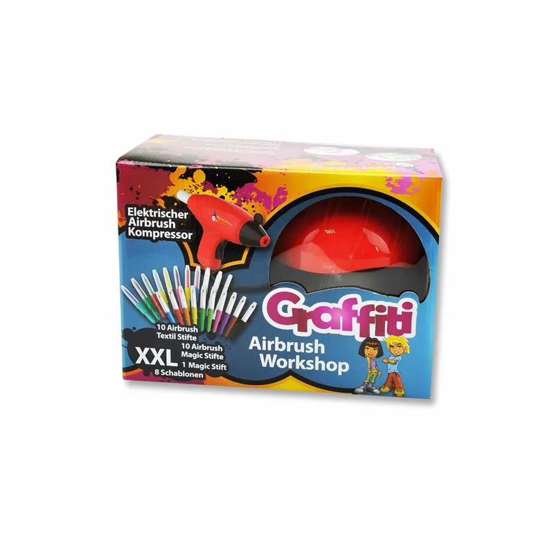 Malinos Graffiti Airbrush Workshop – rot -So macht der Einstieg in das Airbrush Hobby richtig Spaß. Mit dem elektrisch betriebenen Kompressor und dem reichhaltigem Zubehör lassen sich im Handumdrehen beeindruckende Kunstwerke erstellen. Im Lieferumfang sind nämlich bereits 10 x Malinos Airbrush Textil, 10 x Airbrush Magic Stifte und 8 tolle Schablonen enthalten.Die Funktionsweise ist denkbar einfach: Der Stift wird in die Airbrush Pistole eingesetzt und auf Knopfdruck werden dann die Farbpartikel durch den konstanten Luftstrom punktgenau verteilt. Die Sprühstärke kann über ein Ventil manuell eingestellt werden. Ob nun T-Shirts bedruckt werden oder ob auf Papier oder anderen Materialien gesprüht wird – neben dem Spaß sind tolle Ergebnisse garantiert. Der Kompressor arbeitet geräuscharm, hygienisch und umweltfreundlich. Er ist leicht und kompakt und kann somit universell eingesetzt werden. Ein weicher und flexibler Latexschlauch verbindet den Kompressor mit der handlichen Spritzpistole. Einfachste Bedienung durch einen One-Touch-Schalter.Der Kompressor in der ansprechenden Optik eines Pilzes verfügt zudem noch über weitere durchdachte Features. So können Stifte unter dem aufklappbaren Deckel aufbewahrt oder aber in einer seitlichen Ablage griffbereit gelagert werden. Der Graffiti Airbrush Workshop kann mit allen Malinos BloPens verwendet werden.Technische Daten:Motor: Gleichstrom 12VLuftmenge 10,5 l / Min.Max Druck: 35psiAmpere: 1,5 Ageeignet für Kinder ab 6 JahrenLieferumfang:1x Graffiti Airbrush Workshop – rot1x Spritzpistole1x Luftschlauch aus Latex10x Airbrush Magic Stifte10x Airbrush Textil Stifte1x Magic Stift8x Schablonen1x Netzteil1x Bedienungsanleitung (deutsch/englisch)
