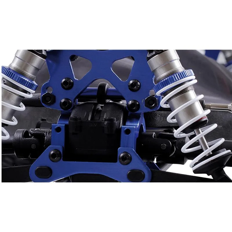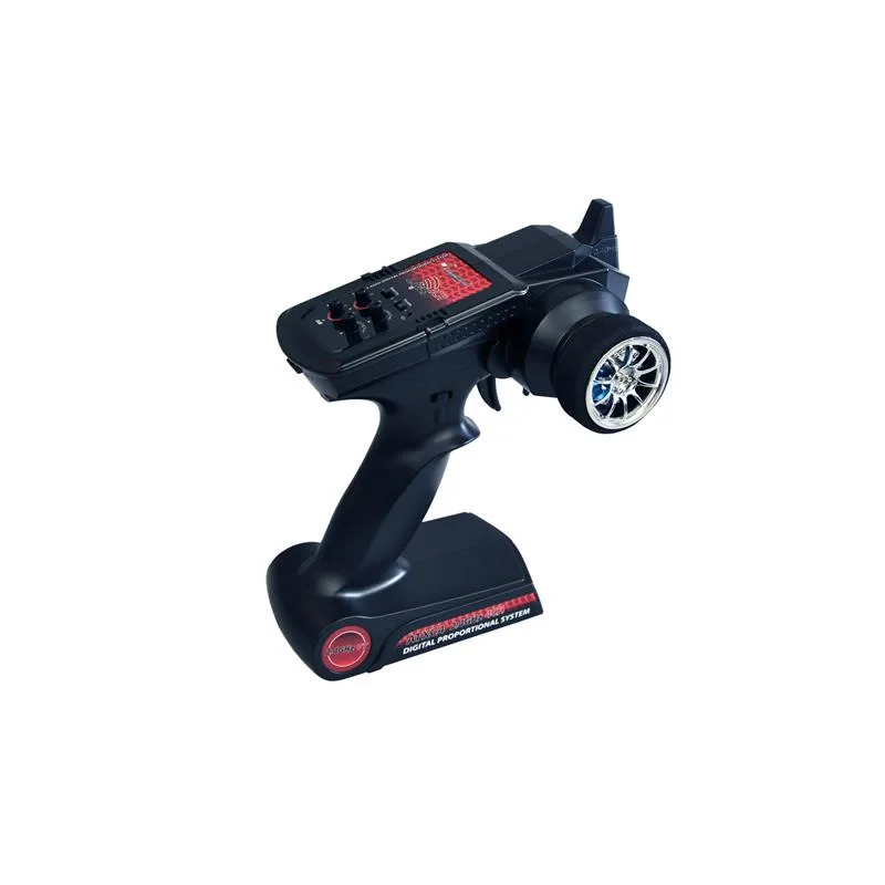 Der starke Akkupack mit 7,4V 3000mAh Lipo 25C ist bereits im Lieferumfang enthalten und wird mit dem beiliegendem 220V LiPo Balance Charger (1A Ladestrom) geladen. Dämpferbrücken, Getriebeverstärkungen und Achsschenkel sind aus hochwertigem in Blau eloxiertem Aluminium hergestellt. Dem Set liegt eine hochwertige 4-Kanal 2,4GHz Pistolenfernbedienung bei, die ein feinfühliges und präzises Steuergefühl bei einer Reichweite von bis zu 150m vermittelt. Für eine optionale Beleuchtung o.ä. bietet der Sender zwei zusätzlich schaltbare Kanäle, Gas/Lenkung sind über den Sender in der Intensität einstellbar (Geschwindigkeit sowie Lenkeinschlag). Weiter verfügt der Sender über zwei Trimmpotis für Gas und Lenkung.