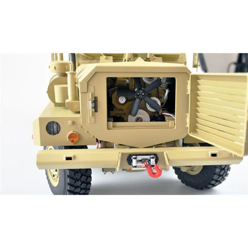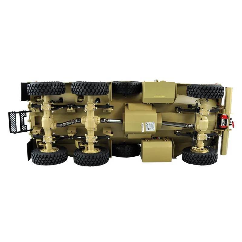 Riesig, massig, wuchtig, Super Scale!Anders lässt sich dieses Modell der Superlative nicht beschreiben. Jedes Detail ist bis in Kleinste nachgebildet. Jede Tür, Jede Luke, jede Klappe und jedes Fach am Fahrzeug lassen sich wie bei Original öffnen und bedienen. Der Geschütz-Turm ist über den mitgelieferten 2,4GHz 16 Kanal Sender um 360°. drehbar. Der Antrieb erfolgt über ein 2-Gang Schaltgetriebe (ebenfalls über Sender schaltbar) an die drei hochwertigen Differentiale und von dort an die Räder verteilt. Durch die extrem hochwertigen Reifen / Felgen wird die gesamte Kraft des Fahrzeuges in jeder Lage in Vortrieb verwandelt und trotz des Gesamtgewichts von nahezu 7kg, ist das Modell auch auf losem Untergrund nicht zu bremsen. Wenn es dann doch mal nicht mehr weiter geht hilft die bereits am Fahrzeug verbaute Seilwinde mit ca. 10kg Zugkraft.Zum Lieferumfang des Modells gehört neben dem Fahrzeug, der 16 Kanal 2,4GHz Sender, ein 4500mAh 2S 7,4V LiPo Akku, ein Aufkleber-Set, Werkzeug, Zubehör und ein LiPo Ladegerät. Sie brauchen nur noch Batterien für den Sender (6x AA Mignon 1,5V). Die maximale Fahrzeit beträgt ca. 20 Minuten und die Ladezeit liegt bei ca. 4 Stunden. Die max. erreichbare Geschwindigkeit liegt im 1. Gang bei ca. 18 km/h, im 2. Gang bei ca. 25 km/h.Weitere Highlights bei dieser Modellversion sind das verbaute Soundmodul mit sämtlichen Effekten für Motor, Gas, Bremse etc., das Lichtmodul welches Beleuchtung des LKWs steuert und das Rauchmodul welches auch die Abgasanlage originalgetreu immitiert.Features:Metall Unterbau (Achsen etc.)Kompletter Innenausbau (Scale)Alle Türen und Luken zum öffnen360°. drehbarer Geschützturm2-Gang Schaltgetriebe16 Kanal Sender / Empfänger 2,4GHzWassergeschütztVoll Geländetauglich6WD AntriebSeilwinde verbaut (10kg)Starker Motor (brushed)Digitales Lenkservo mit MetallgetriebeReichweite ca. 100mScalefederungssystemAufbau aus schlagfestem ABSKomplette Beleuchtung LEDRauchmodul verbautSoundmodul verbautTechnische Daten:Länge: 647mmBreite: 232mmHöhe: 293mmGewicht: ca. 7kgRadstand: 314 / 115mmSpurbreite: 222mmRadgröße: 100mmAkku: LiPo 7,4V 4500mAh 30CFahrzeit: ca. 30 MinutenLadezeit: 240 MinutenReichweite: ca. 80 – 100 MeterHöchstgeschwindigkeit: max. ca. 25km/hLieferumfang:Modell 6×6 ScaleSender 16 Kanal 2,4GHzAkku LiPo 7,4V 4500mAh 30CLadekabelZubehörRauchöl