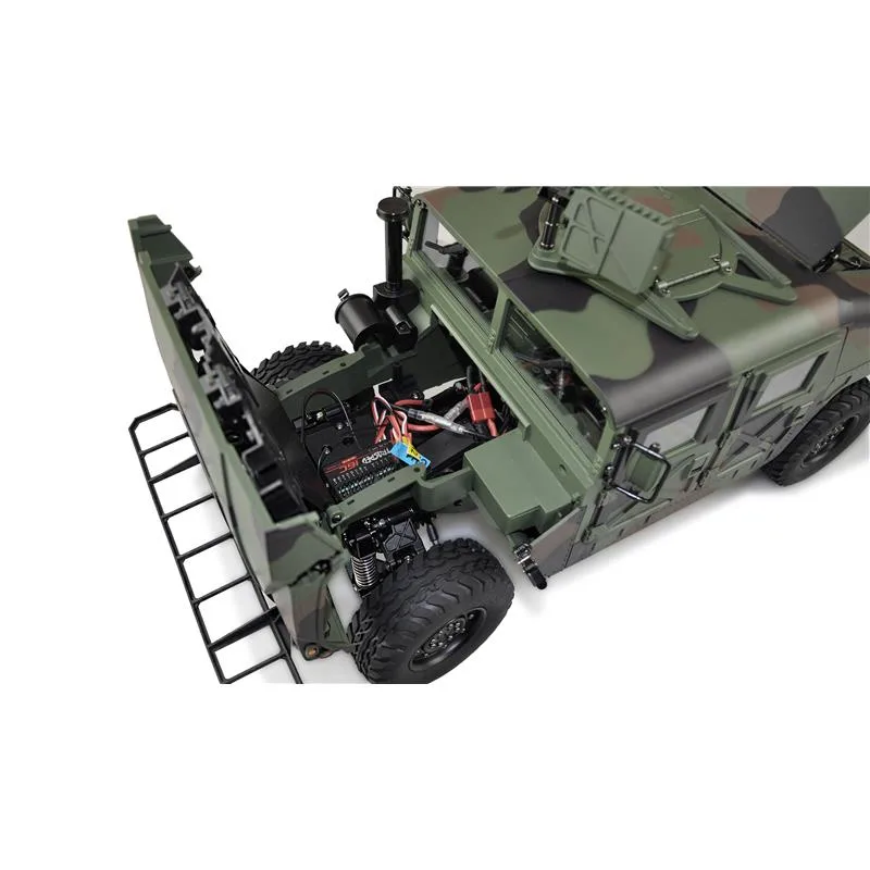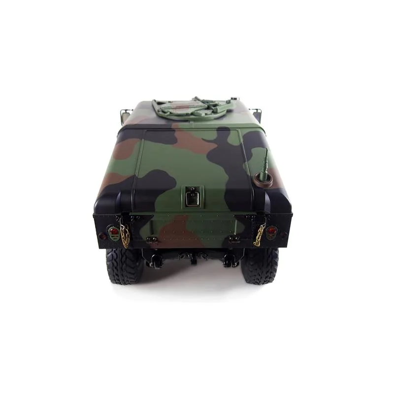 Ein technisches Meisterwerk aus Teilmetall als wunderbarer Scaler in RTR-Version (Ready-to-Run) mit vielen Anbauteilen – dieses edle Fahrzeug im Maßstab 1:10 setzt neue Maßstäbe durch eine unglaubliche Detailtreue und durch neueste Technik. Das Modell besticht durch eine schöne Lackierung, ein 2-Gang-Schaltgetriebe, ein vollständig geschütztes Fahrwerk, eine wassergeschützte Elektronik, viel optionales Zubehör wie Sound- oder Lichtmodul. Portalachsen und ein Scale-Fahrwerk mit komplettem Scale-Unterboden gehören ebenfalls zur Serienausstattung dieses Geländefahrzeuges. Alle Türen sind von außen bequem zu öffnen und der Innenraum ist komplett ausgebaut – sogar die Sitze sind mit einer gummierten Oberfläche veredelt. Die Heckklappe ist mit zwei Metalldämpfern ausgestattet, die die Klappe geöffnet halten. Die Motorhaube enthält sogar mit zwei seitlichen Metallverriegelungen: Darunter befindet sich eine Scale-Motorattrappe und der Empfänger mit 16 Kanälen. Vom Sender (ebenfalls 16 Kanäle) sind folgende Funktionen zusätzlich steuerbar: Licht, Sound, Smoke, Winde, Lenkung (bei Umbau auf Mehrachslenkung). Es zudem noch einige freie Kanäle, sollte nachträglich noch das ein oder andere optionale Zubehörteil angebaut werden. Im Dach ist eine aufklappbare Luke für den MG-Schützen.