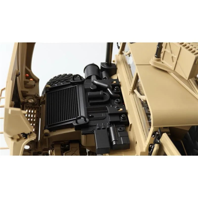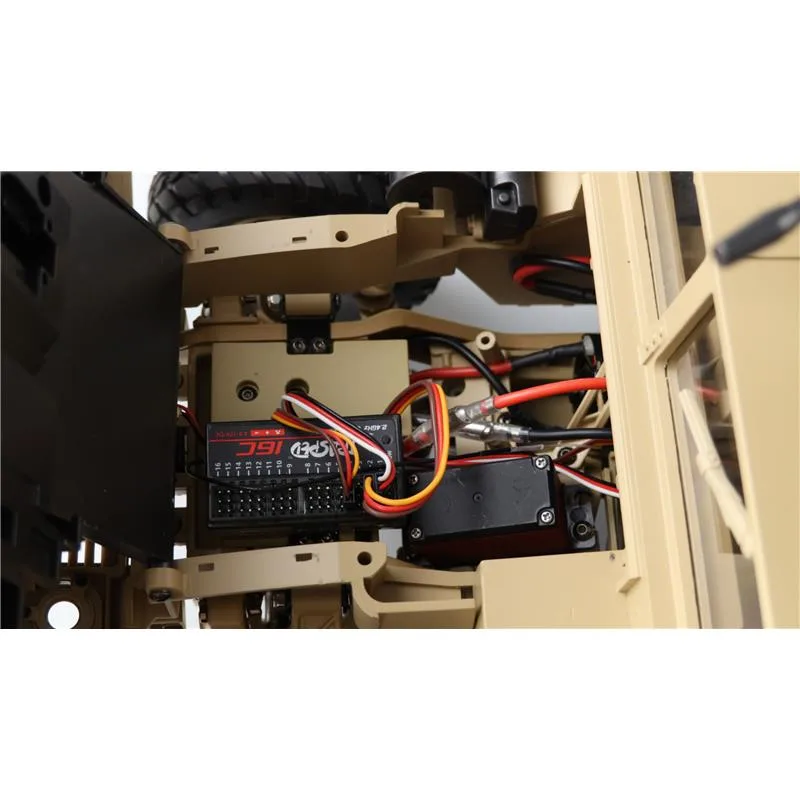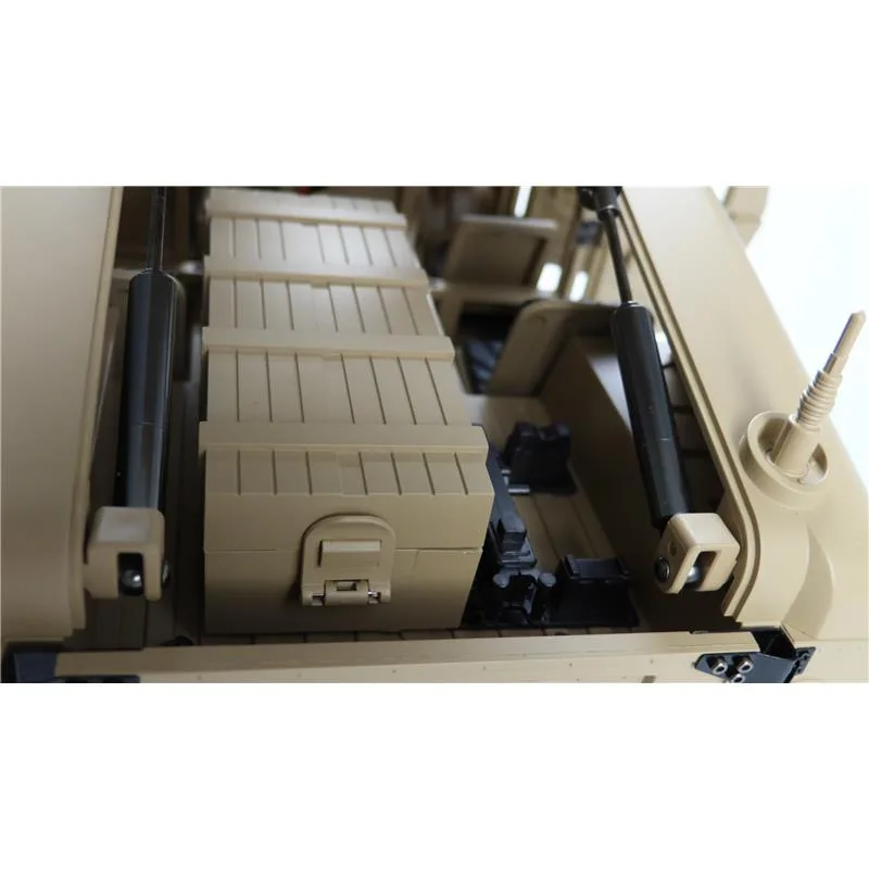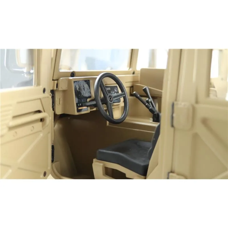 Portalachsen und ein Scalefahrwerk mit komplettem Scale Unterboden gehören ebenfalls zur Serienausstattung dieses Geländefahrzeuges. Alle Türen sind von außen bequem zu öffnen und der Innenraum ist komplett ausgebaut (sogar die Sitze sind mit einer gummierten Oberfläche veredelt) Die Heckklappe ist mit 2 Metalldämpfern ausgestattet, die die Klappe geöffnet halten. Die Motorhaube ist sogar mit 2 seitlichen Metallverriegelungen ausgestattet. Darunter befindet sich eine Scale Motorattrappe und der Empfänger mit 16 Kanälen. Vom Sender (ebenfalls 16 Kanäle) sind folgende Funktionen zusätzlich steuerbar: Licht, Sound, Smoke, Winde, Lenkung (bei umbau auf Mehrachslenkung) usw. Es zudem noch einige freie Kanäle, nachträglich noch das ein- oder andere optionale Zubehörteil angebaut werden soll. Im Dach ist eine aufklappbare Luke für den MG Schützen.