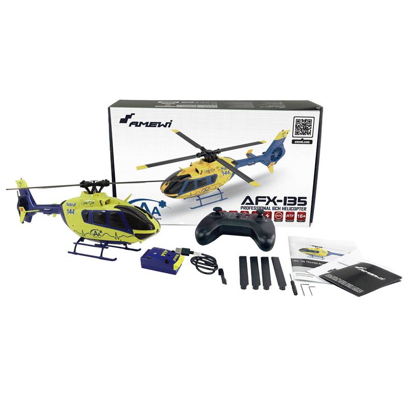 Zusätzlich kann die AFX-135 Pro ab einer Sicherheitshöhe von etwa neun Metern auf Knopfdruck in den Rückenflug wechseln. Für ausreichend Leistung bei solchen Flugmanövern ist der Scale-Hubschrauber mit zwei Hochleistungs-Brushless-Motoren (vorne/hinten) ausgestattet. Weitere Features sind z.B. das automatische Höhenhalten durch verschiedene optische und elektronische Sensoren.