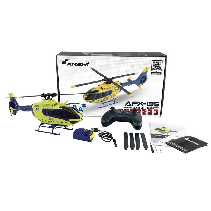 Das Modell wird als RTF-Version (Ready-to-Fly) ausgeliefert, d.h. alle Komponenten – bis auf haushaltsübliche Batterien für die Fernsteuerung – sind bereits im Paket enthalten und der Heli kann nach Laden des Akkus sofort gestartet werden.