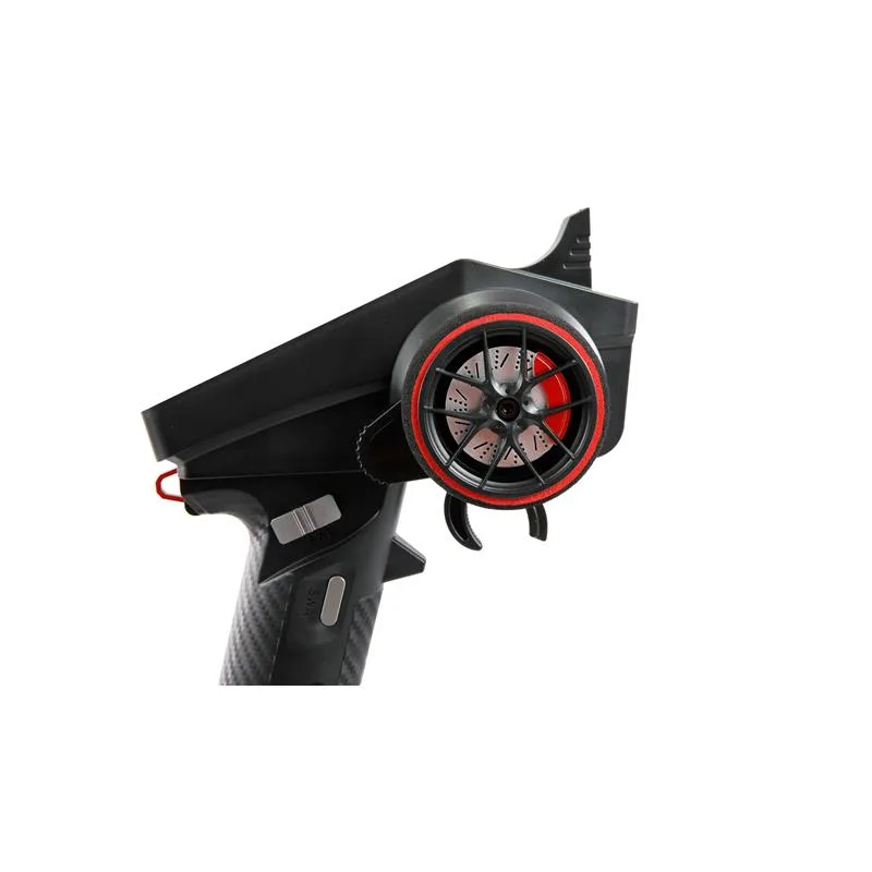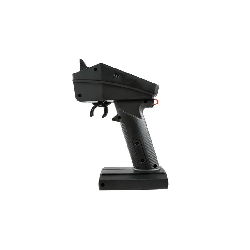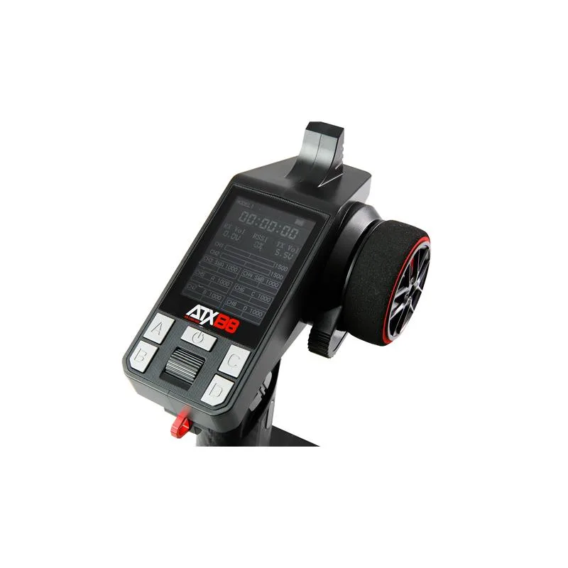 Die 8-Kanal-Pistolenfernsteuerung ATXB8 bietet zahlreiche Funktionen und ist einfach zu bedienen. Alle Kanäle sind programmierbar, es gibt einen Speicher für bis zu 8 Modelle sowie ein großes Farbdisplay, das eine klare Übersicht bietet. Zusätzlich verfügt die Fernsteuerung über Mischfunktionen für diverse Kanäle, um eine flexible Steuerung zu ermöglichen. Eine integrierte Telemetriefunktion zeigt die Akkuspannung des Modells bzw. der Empfängerstromversorgung in Echtzeit direkt auf dem Display an. Weitere praktische Funktionen umfassen eine Dual-Rate-Einstellung für Gas und Lenkung sowie die Möglichkeit, die Servorichtung für alle Kanäle individuell anzupassen. Für eine bequeme Einhandbedienung wurde ein zusätzlicher Hebel am Lenkrad integriert. Über den USB-C-Anschluss kann das System einfach aktualisiert werden oder beispielsweise für Simulatoren genutzt werden. Die Bedienung der Fernsteuerung erfolgt über Gas, Lenkung, einen Drucktaster am Griff (SWB), einen Drei-Wege-Schalter über dem Griff (SWA) sowie vier Tasten an der Oberseite. Die digitale Trimmung speichert alle Einstellungen dauerhaft, auch wenn die Fernbedienung aus- und wieder eingeschaltet wird. Ein weiteres Sicherheitsmerkmal ist die automatische Abschaltfunktion, die nach 15 Minuten ohne Eingabe aktiv wird. Der Sender gibt dabei eine Minute vorher einen Piepton aus, bevor er sich ausschaltet, um die Batterie zu schonen. Als zusätzliches Feature ist ein integriertes Autorennspiel verfügbar, das über Lenkung und Gas der Fernsteuerung gesteuert wird, während das Display als Bildschirm für das Spiel dient.