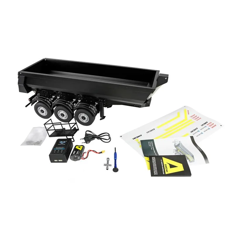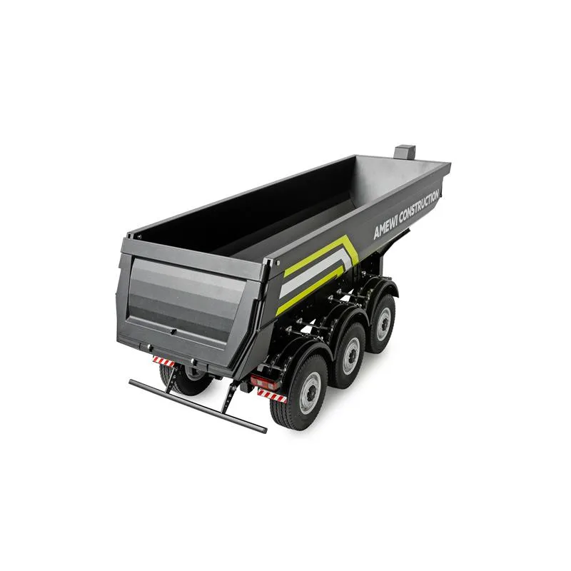 Der ferngesteuerte Dreiachs-Sattelauflieger mit Kippmulde aus Metall im Maßstab 1:14 überzeugt durch hohe Detailtreue, robuste Verarbeitung und realistische Funktionen. Die Kippmulde ist mit einem elektronischen Spindelantrieb und einem Scherenmechanismus ausgestattet, der eine authentische Kippbewegung bis zu 47° ermöglicht. Dank der vollständig aus Metall gefertigten Rahmen- und Muldenkonstruktion sowie der drei Achsen mit Blattfederung und pendelachseähnlichem Mechanismus bietet der Trailer eine stabile und langlebige Basis für anspruchsvolle Modellbau-Einsätze.