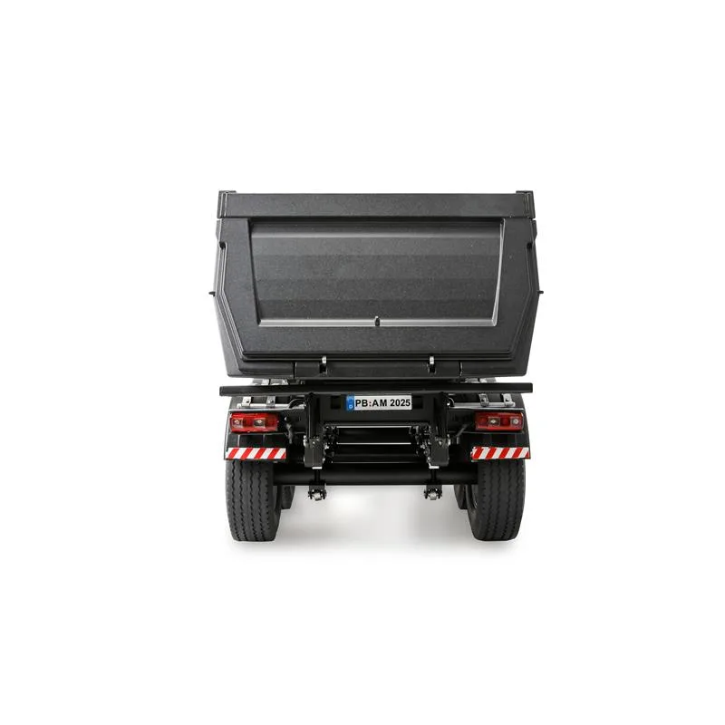 Mit einer hohen Zuladung von bis zu 15kg ist der Kippanhänger für vielfältige Einsatzszenarien geeignet. Praktische Stützen mit mechanischer Funktion erlauben das Abstellen des Aufliegers unabhängig von der Zugmaschine. Der Trailer wird komplett montiert geliefert, inklusive Elektronik, Beleuchtung, Kippmechanismus, Akku für Elektronik und Beleuchtung, Ladegerät, Werkzeug und Dekorbogen. Mit einer Länge von 662 mm, Breite von 184 mm und Höhe von 241 mm sowie einem Gewicht von 7,2 kg bietet er ein realistisches und gleichzeitig robustes Modellbauerlebnis.