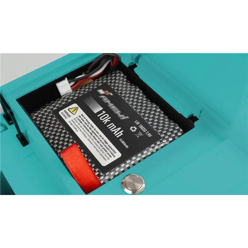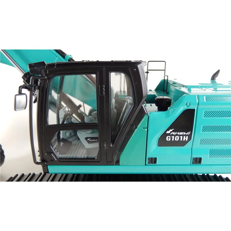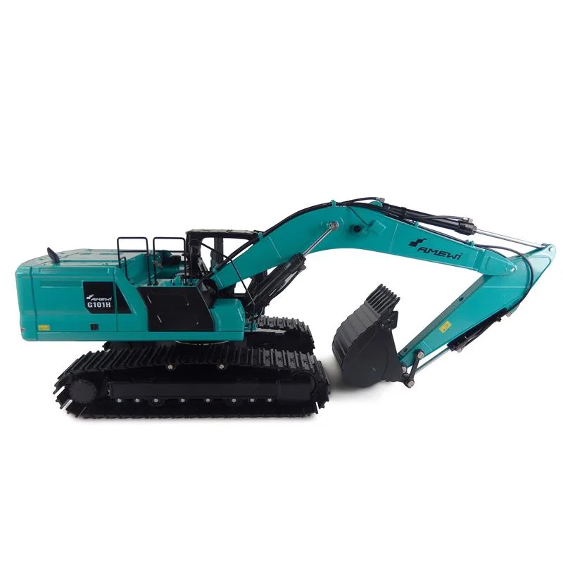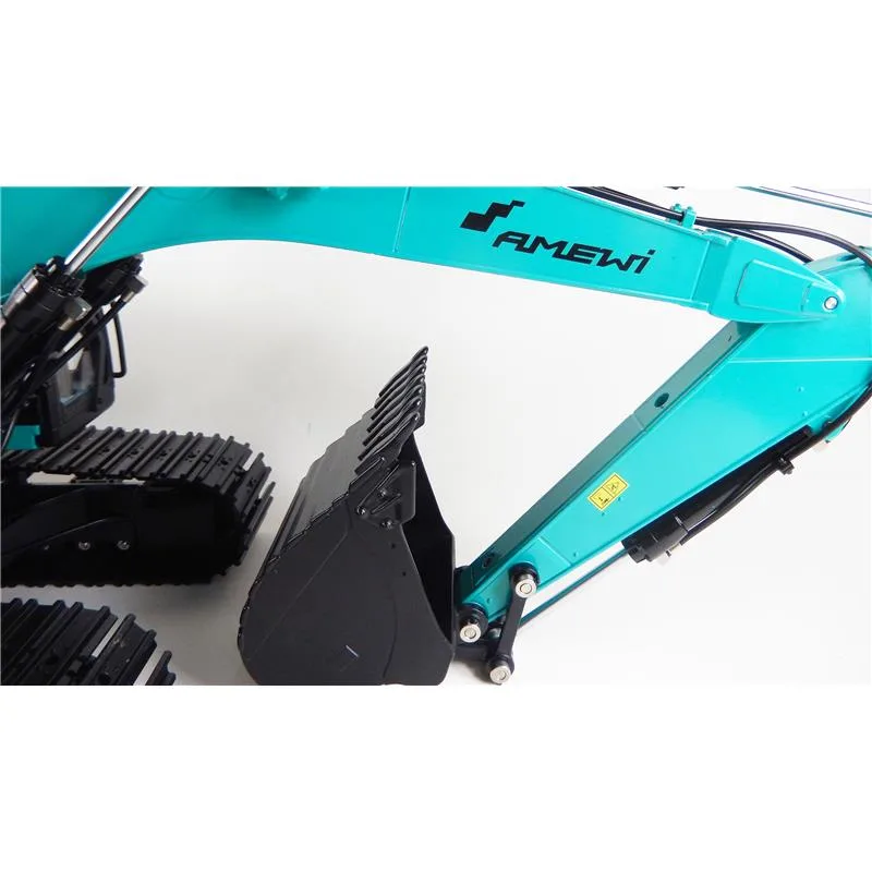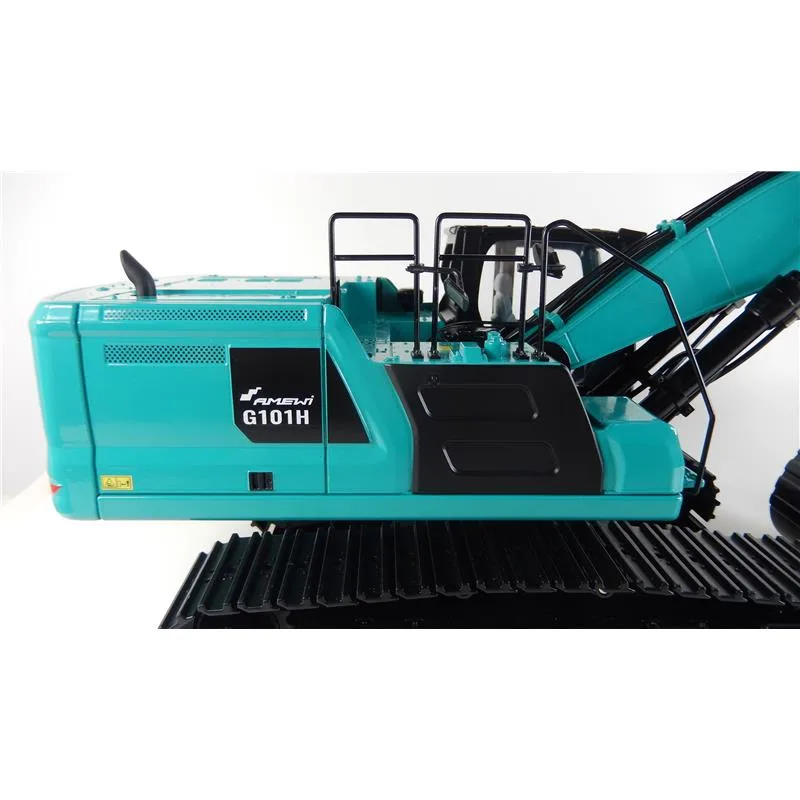 Der G101H V2 ist ein Hydraulik-Vollmetallbagger im Maßstab 1:16, der als RTR-Modell im Originaldesign mit einer exklusiven Petrol-Lackierung mit 2,4GHz Fernsteuerung, Akku, Ladegerät und allem Zubehör, was für den Betrieb erforderlich ist, ausgeliefert wird. Hochwertige Verarbeitung gepaart mit hochwertiger Technik, so lässt sich dieses Modell treffend beschreiben. Der gesamte Aufbau besteht aus Metall. Die Ausleger sowie der Löffel (Schaufel) werden hydraulisch bewegt, der Fahrapparat und die Hydraulikpumpe werden elektrisch mit Brushless-Motoren angetrieben. Somit steht genügend Kraft für anstehende Arbeiten zur Verfügung. Das Modell ist dabei sehr feinfühlig über die mitgelieferte Fernsteuerung mit Eurosteuerung (Knüppelbelegung wie im echten Bagger) zu bedienen. Die Lieferung dieses Vollmetall-Hydraulikbaggers erfolgt in einer stabilen Echtholzkiste. Alle Modelle werden vor der Auslieferung von unseren Technikern geprüft und getestet. Die Änderungen gegenüber der V1 Version betreffen hier ausschließlich den inneren technischen Aufbau und die Hydraulik.