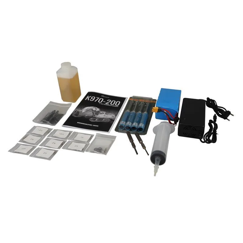 Alle Funktionen sind sehr feinfühlig steuerbar und vermitteln ein sehr angenehmes Arbeitsgefühl. Der Antrieb des K970-200 SME ist mit einem hochwertigen Brushless-Motor ausgestattet und ermöglicht realistische Fahrzustände inkl. originalgetreuem Sound wie z.B. Kettengeräusch, Arbeitsgeräusch und Motorsound. Der Drehkranz sowie das modulare Hydraulik-Kreislaufsystem werden ebenfalls von hochwertigen Brushless-Motoren angetrieben. Die gesamte Hydraulikeinheit ist mit hochpräzisen Servos ausgestattet, die den Durchfluss der Ventile steuern. Durch einen CNC-gefrästen Aluminiumkühler und einen sehr hochwertigen Ölfilter unterstützt, wird das Hydraulik-Öl sauber und bei passender Temperatur gehalten. So steht einem ungetrübten, einzigartigen Fahrerlebnis nichts mehr im Wege. Der ebenfalls mitgelieferte Li-Ion Akku 3S 11,1V 15.000mAh sorgt dabei für ausreichend Fahr- und Betriebszeit.
