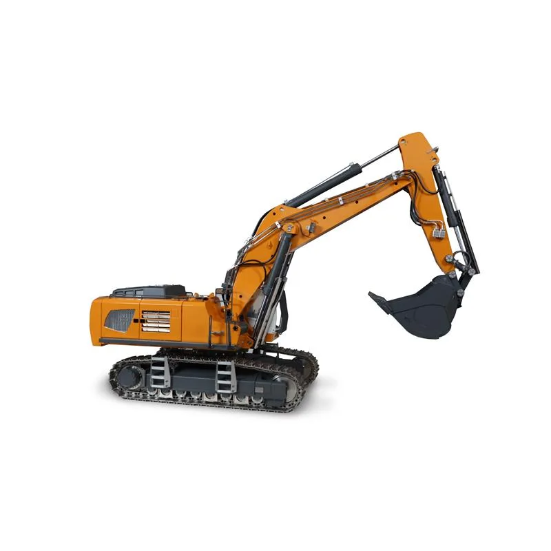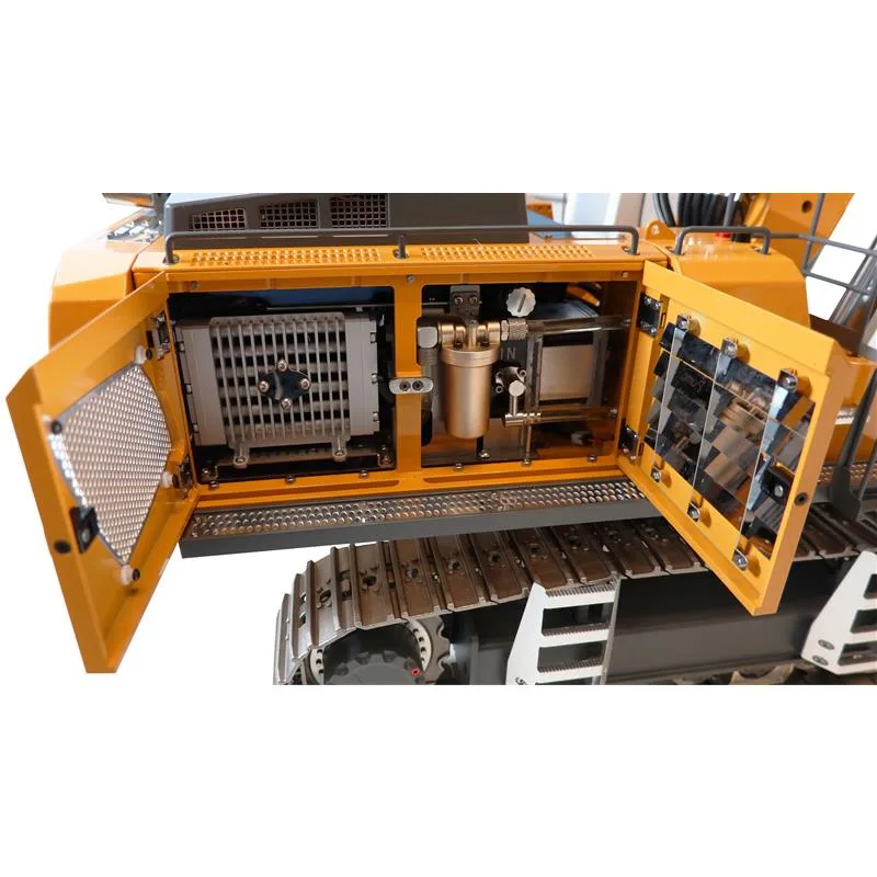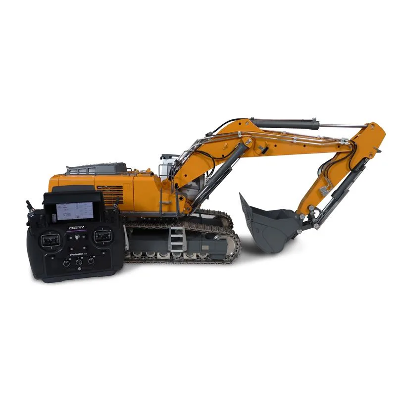 Der G308H ist aus Vollmetall gefertigt und bringt fahrfertig stolze 30,8kg auf die Waage. Die Stellkraft der Ausleger liegt bei etwa 30kg und das Fassungsvermögen der massiven Schaufel beträgt ca. 1,3l. Wer sehr viel Material bewegen möchte, findet hieran wahre Freude. Die Ausleger inkl. des Löffels lassen sich ca. 0,5m nach unten bewegen. Alle Funktionen sind dabei sehr feinfühlig steuerbar und vermitteln ein sehr angenehmes „Arbeitsgefühl. Der Antrieb des Baggers ist mit einem hochwertigen Brushless-Motor ausgestattet und ermöglicht realistische Fahrzustände inkl. originalgetreuem Sound wie z.B. Kettengeräusch, Hydrauliksound (Arbeitsgeräusch) und Motorsound. Der Drehkranz des Modells und auch das modulare Hydraulik-Kreislaufsystem werden ebenfalls von hochwertigen Brushless-Motoren betrieben. Die gesamte Hydraulikeinheit ist mit hochpräzisen Servos ausgestattet, die den Durchfluss der Ventile steuern. Das gesamte Hydrauliksystem wird durch einen CNC-gefrästen Aluminiumkühler und einen sehr hochwertigen Ölfilter unterstützt, um das Hydraulik-Öl sauber und bei passender Temperatur zu halten. So steht einem ungetrübten, einzigartigen Fahrerlebnis nichts mehr im Wege. Der ebenfalls mitgelieferte Li-Ion Akku 3S 11,1V 15.000mAh sorgt dabei für ausreichend Fahr- und Betriebszeit.