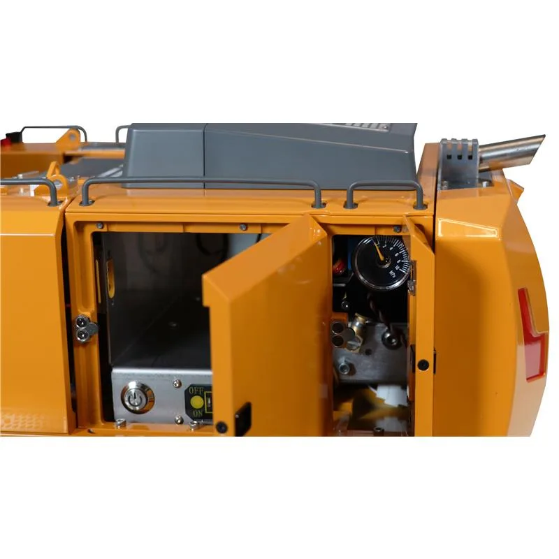 Der Aufbau des Modells mit der gut zugänglichen Hauptelektronik ermöglicht den Einbau eines optionalen Rauchmoduls unter der hinteren Abdeckung – der passende Auspuff dafür ist schon serienmäßig verbaut. Zusätzlich sind zwei weitere Hydraulik-Kreisläufe am vorderen Ausleger des Modells untergebracht, um optionale Arbeitsgeräte wie z.B. eine Hydraulik-Schere o.Ä. direkt anschließen zu können.