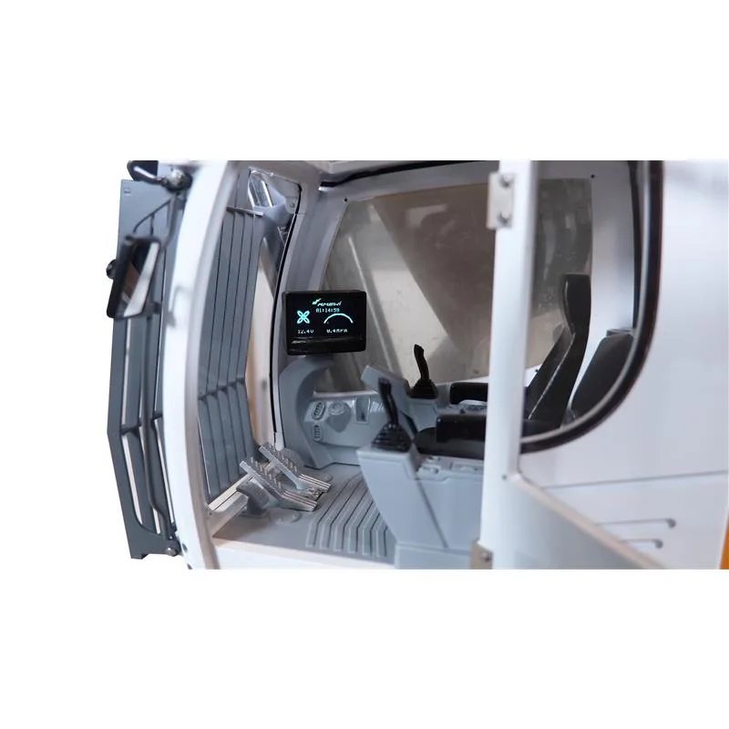 Mit einer hochwertigen 2,4GHz Sendeanlage (18 Kanäle) ausgeliefert, verfügt der Sender über Hall Sensoren, Telemetrie, Touchdisplay und eine waschechte Eurosteuerung, d.h. die Senderknüppel sind wie im echten Bagger belegt. Alle Funktionen wie z.B. Beleuchtung, Sound, Fahreigenschaften – in unserer Amewi Edition werden diese über zwei seitliche Steuerhebel am Sender bedient – und auch die Schnellwechsler für Arbeitsgeräte sind bequem über Schalter und Sticks vom Sender aus zu bedienen.