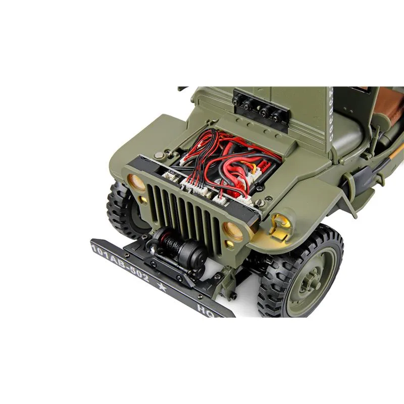 Für ein realistisches Erscheinungsbild verfügt der Jeep Willys MB über zahlreiche Scale-Details wie eine klappbare Frontscheibe, eine abnehmbare Dachkonstruktion, eine klappbare Motorhaube mit Zugang zur Elektronik sowie einen umklappbaren Rücksitz, der das Akkufach verdeckt. Eine funktionierende Seilwinde und eine Anhängerkupplung erweitern die Einsatzmöglichkeiten. Die Scale-LED-Beleuchtung mit beleuchteten Scheinwerfern und Rücklichtern sowie das über DIP-Schalter regelbare Sound- und Beleuchtungssystem tragen zusätzlich zum authentischen Gesamteindruck bei.