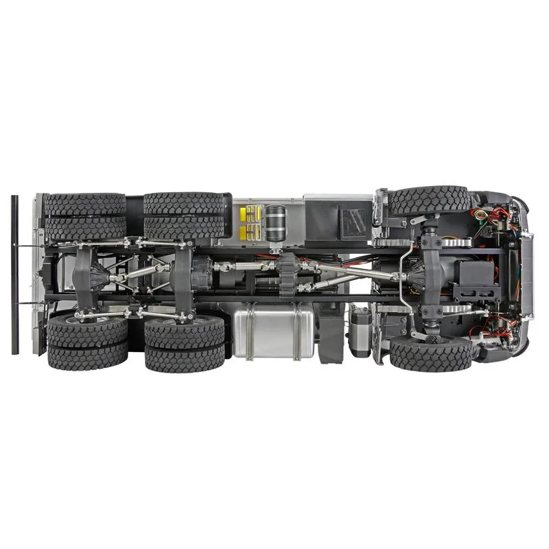 Das Modell ist vollständig fahrbereit (RTR) und wird inklusive Fernsteuerung, Akku und Ladegerät geliefert. Dank des vollmetallenen Antriebsstrangs und der drei Differentialgetriebe ist eine hohe Haltbarkeit und zuverlässige Kraftübertragung gewährleistet. Der permanente 6WD-Antrieb in Kombination mit der pendelgelagerten Doppelbereifung der Hinterachse bietet maximale Traktion auch im unwegsamen Gelände. Über die Fernsteuerung lässt sich ein 2-Gang-Getriebe schalten: ein Gang liefert maximale Kraft im Gelände, der zweite eignet sich für höhere Geschwindigkeit auf längeren Strecken. Das eingebaute Lenkservo mit Metallgetriebe sorgt für präzise Steuerung auch unter Last.