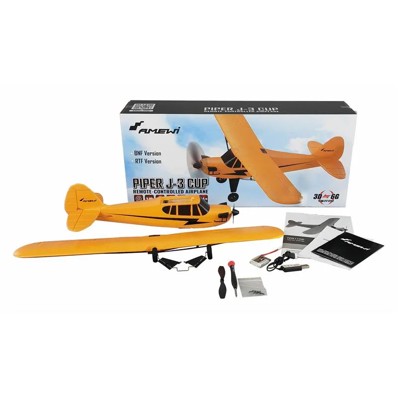 Scale-Nachbau einer Piper J-3 CUP mit ausgezeichneten Flugeigenschaften, der sich dank eingebautem Gyro (Fluglagenstabilisator) besonders für Einsteiger geeignet und allen angehenden Piloten schnellen wie sicheren Flugerfolg ermöglicht. So neutralisiert der Gyro nahezu alle äußeren Einflüsse wie z.B. Wind – auch Steuerfehler werden ausgebügelt, wenn die Steuerknüppel einfach wieder in die neutrale Position gebracht sind. Ein Lagensensor verhindert gleichzeitig ein etwaiges Überziehen im Gyro-Modus (max. Steig- und Sinkrate ca. 15-20°). Als 3-Kanal-Modell wird die Piper J-3 CUP nur über den Motor, das Höhenruder und das Seitenruder gesteuert. Der gesamte Aufbau ist aus nahezu unzerstörbarem EPP-Material. Härtere Landungen oder leichte Abstürze werden deshalb klaglos weggesteckt, was einen langen Flugspaß ermöglicht. Der Propeller, bestehend aus schlagfestem Kunststoff, wurde extra für dieses Modell entwickelt. Die Haltbarkeit sowie der Wirkungsgrad sind insgesamt hervorragend – in Verbindung mit dem starken Antrieb (drei 0720 Hollow-Cup Bürstenmotoren, die auf eine Hauptwelle greifen) stehen hier beachtliche Flugleistungen zur Verfügung. Die schnellen Digital Servos mit 0,08sek / 60° sorgen dabei für ein direktes, präzises Steuergefühl. Bevor es mit dem Erstflug losgehen kann, ist nur die Montage der Tragflächen und des Fahrwerks erforderlich. Parallel dazu den Akku laden und schon kann gestartet werden.