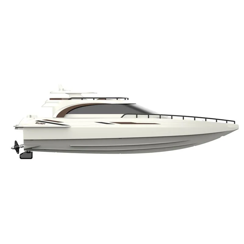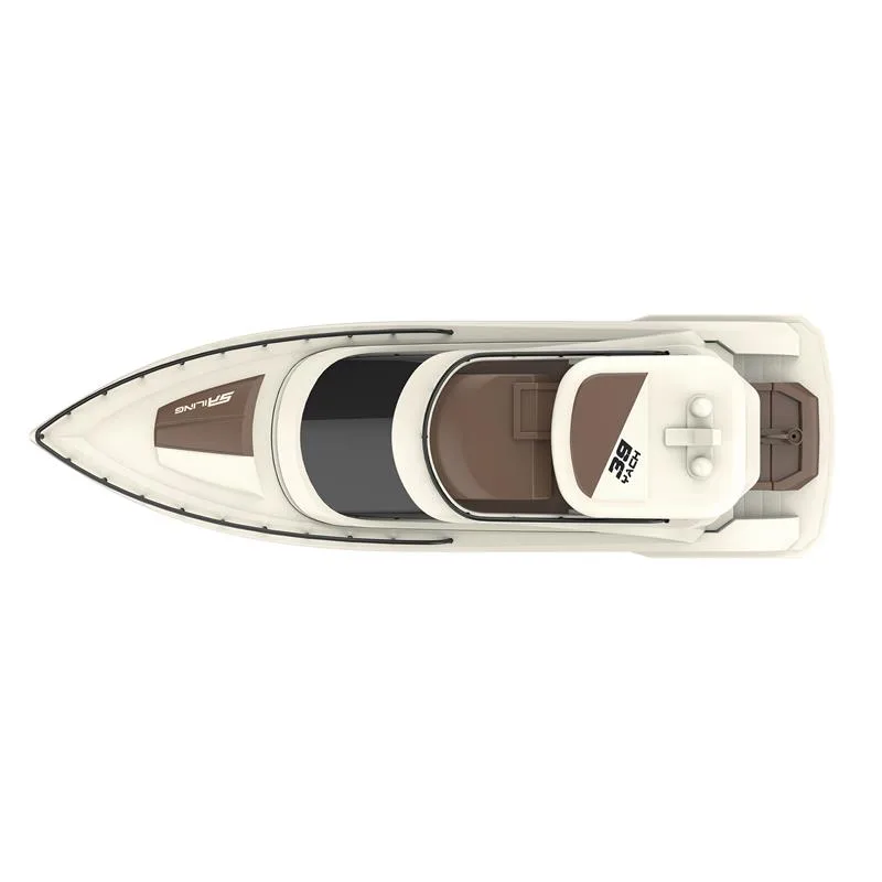 Optisch ein Hingucker: Flaches Vordeck mit großzügiger Sunbed-Area, abgedunkelte Fenster und das zeitlose auf dynamisches Fahren ausgelegte Rumpfdesign unterstreichen den sportlichen Gesamtcharakter. Mit dem edlen Braun-Cremeweiß macht dieses RC-Rennboot am See, auf dem Teich oder im Pool bei passendem Wetter eine beeindruckende Figur.