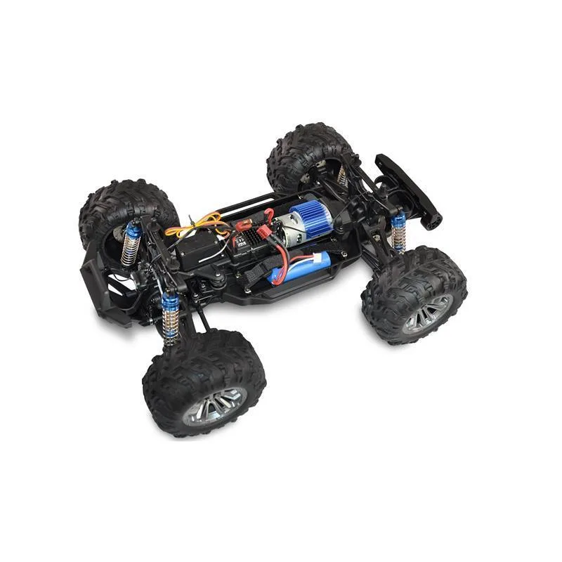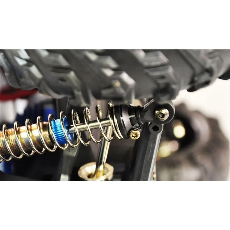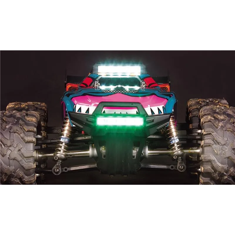 Auch die weiteren Features wissen zu überzeugen: Die Öldruckstoßdämpfer, übergroßen Reifen, das Fahrwerk, die Metall-CVD-Antriebswellen vorne, Metallantriebswellen hinten, Metall Kardanwellen, Metallbodenplatte und die Metallgetriebe im Fahrzeug sorgen für eine lange Haltbarkeit. Eine komplett schaltbare und helle LED-Beleuchtungsanlage (vorne, hinten, Dach) runden das gesamte Paket ab. Als optischer Aspekt wurde das Modell rundherum mit Bremsscheiben-Attrappen ausgerüstet. Ein zusätzlicher Pluspunkt ist das Sende- / Empfangssystem in 2,4GHz, das bereits komplett eingestellt ist. Über einen frei belegbaren, vierten Kanal verfügend können Zubehörteile verwendet werden. Zur Sicherheitsausstattung des Modells gehört unter anderem eine Akku-Überwachung, welche sich bei Unterspannung lautstark bemerkbar macht und das Fahrzeug bei Nichtbeachten in den Ruhemodus versetzt. Die gesamte Elektronik und auch das Servo ist vor Spritzwasser geschützt. Einem Einsatz im harten Outdoor-Gelände sind somit kaum Grenzen gesetzt.