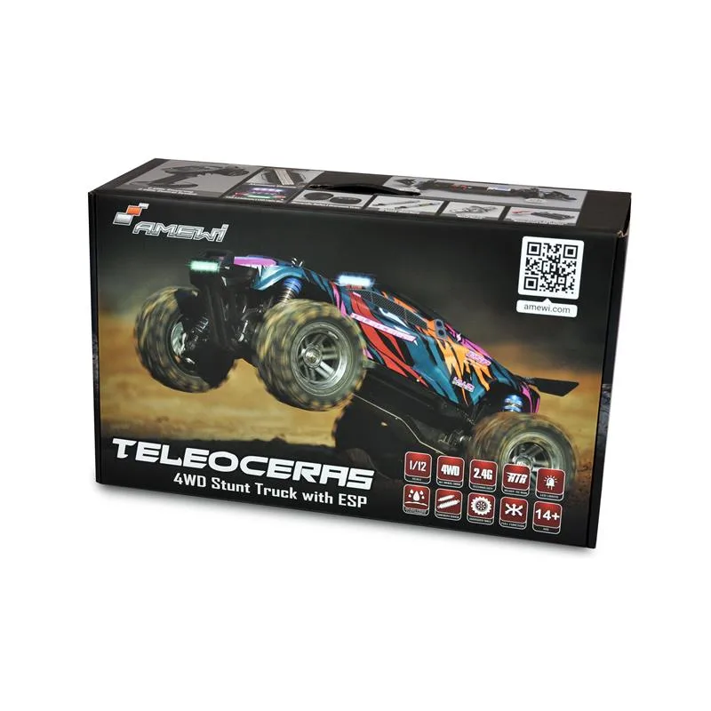 Ein völlig neu entwickelter 4WD Truggy im Maßstab 1:12 mit feinster Ausstattung und hochwertiger Technik – das Modell ist im Gegensatz zu den meisten 1:12ern am Markt mit einem 540er Brushed-Motor ausgestattet, was deutlich höhere Geschwindigkeiten zulässt. Um die Kraft kontrolliert umzusetzen, wurde der Teleoceras mit einem Fahrstabilitätssystem (Gyro) ausgerüstet, das sich über den Sender feinfühlig und stufenlos regeln lässt.