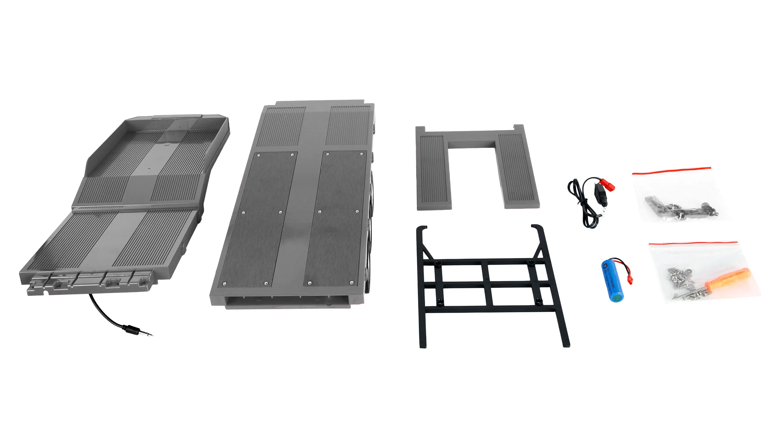 Lieferumfang: Sattelauflieger-Bausatz, teilmontiert Akku Ladekabel Werkzeug Anleitung DE/EN