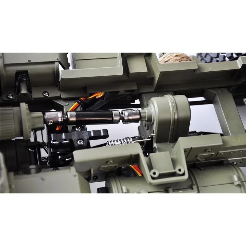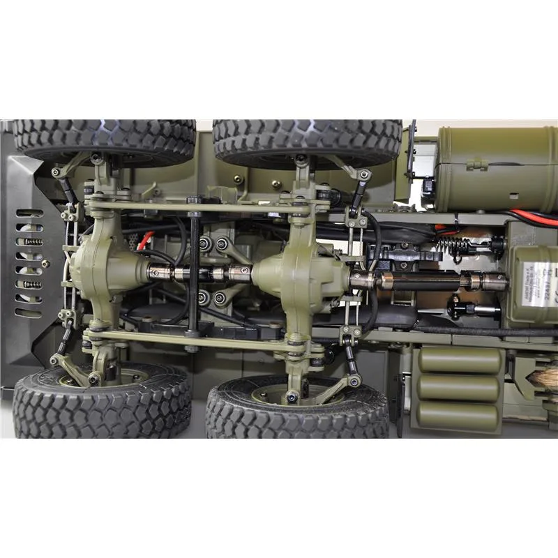 Super schönes Scale Modell in feinster Ausstattung! Das Modell kommt als RTR Fahrzeug und lässt keine Wünsche offen in punkto Leistung und Optik! Jede Menge Scale Details und ein originaler Dekorbogen zur Veredelung des Fahrzeuges runden den Gesamteindruck ab. Dieser LKW sieht nicht nur schön aus, er kann auch was! Duch den robusten Aufbau in Verbindung mit dem sehr feinfühligen Sender fühlt sich das Modell auf jedem Untergrund wohl und ist so mit voll Geländetauglich. Zusätzlich ist die elektrische Aussattung Spritzwasser geschützt und hällt auch dem härtesten Gelände stand. Die beiden Vorderachsen sind über eine Seilzuganlenkung miteinander verbunden und ermöglichen eine Spielfreie Anlenkung. Der Wendekreis des Modells ist durch die verbauten Achsdifferentiale sehr klein und machen das Fahrzeug sehr wendig.Um im Gelände problemlos voran zu kommen, sind alle Achsen über Kardans angetrieben und erzeugen in Verbindung mit dem 550er Motor ein sehr gutes Drehmoment. In Sachen Preis / Leistung wird dieses Modell neue Maßstäbe setzen und die Scale Szene nachhaltig beeinflussen. Die Karosserie ist bereits mit einem hochwertigen Beleuchtungsset und einem Soundmodul ausgestattet! In dieser Version ist zusätzlich die Ladefläche über den neuen 8 Kanal Sticksender 2,4GHz Kippfähig. Über zwei Hubstangen (Spindeln) in Verbindung mit einem kräftigen E – Moter können auch höre Zuladungen problemlos abgekippt werden!Features:550 brushed motorSchaltbares 2-Gang Getriebe2,4GHz 8 Kanal FernsteuerungKippfähige Muldeeingebautes Beleuchtungsseteingebautes SoundmodulMetallrahmenMetallachsenMetallantriebswellenFederstahl- und Teleskop DoppeldämpferEinzelradaufhängungScalebereifung GummiBautenzug Doppellenkung (beide Vorderachsen)8×8 AllradantriebTechnische Daten:Länge: 740mmBreite: 220mmHöhe: 240mmGewicht: 8,8kg fahrfertigAkku: Lithium 7,4V 3000mAhFahrzeit: 20-30 MinutenLadezeit: ca. 240 MinutenGeschwindigkeit 1. Gang 12km/hGeschwindigkeit 2. Gang 18km/hLieferumfang:Scale Truck 8×8 RTR2,4GHz 8 Kanal FernsteuerungLithium Akku 7,4V 3000mAhLadegerätAnleitung (DE / EN)