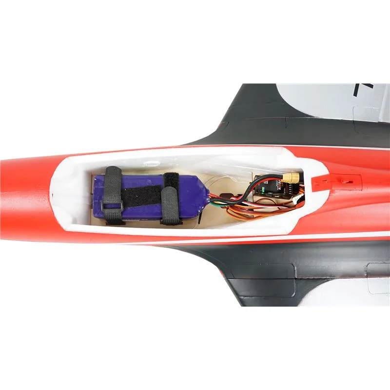 Der Aufbau dieses weitestgehend vorgefertigten PNP-Modells beschränkt sich auf das Anbringen des Höhenruders und der Tragflächen. Alle Teile werden geschraubt und alle Kabel, die Randbogenbeleuchtung, das Fahrwerk und eine Verteilerplatine, auf der alle elektrischen Komponenten zusammenlaufen, sind fertig im Modell eingebaut. Im Rumpf sind am Höhenruder Servo-Verlängerungen integriert. Die Tragflächen werden über einen mehrpoligen Steckverbinder mit dem Gegenstück im Rumpf verbunden und mit vier Schrauben befestigt. So wird die Verbindung zum Querruder, den Landeklappen, der Beleuchtung und dem Fahrwerk hergestellt. Das Fahrwerk ist elektrisch, aus Metall gefertigt und geschleppt. Unebenheiten beim Start und etwas härtere Landungen stellen kein Problem dar. Dank der üppigen Leistung des fein-gewuchteten 80mm 12-Blatt-Impellers und des Hochleistungs-Brushless-Motors mit einer spezifischen Drehzahl von 2200KV an 6S gelingen Starts auch auf Gras bereits nach einer kurzen Startstrecke. Die erreichbare Höchstgeschwindigkeit liegt bei über 200km/h, die Flugzeit mit z.B. 5000mAh 6S bei ca. 5-6 Minuten (je nach Flugstil auch mehr). Zum Landen können die Landeklappen ausgefahren werden, wodurch die Geschwindigkeit des Modells deutlich abnimmt.