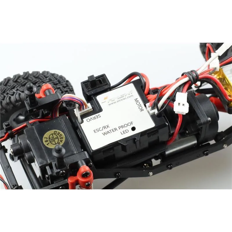 AMX Rock Crawler 1:24 4WD. Ein toller Semi-Scaler dem durch seine Features der Spagat zwischen Crawler und Cruiser problemlos gelingt. Viele realistische und liebevoll gestaltete Details wie die Karosserie und dem Reserverad am Heck Die extrem weichen M / T Reifen warten förmlich auf einen wilden Ausritt über Stock und Stein sowie auf schwierige Schlammpassagen. Die Elektronik ist wassergeschützt untergebracht.