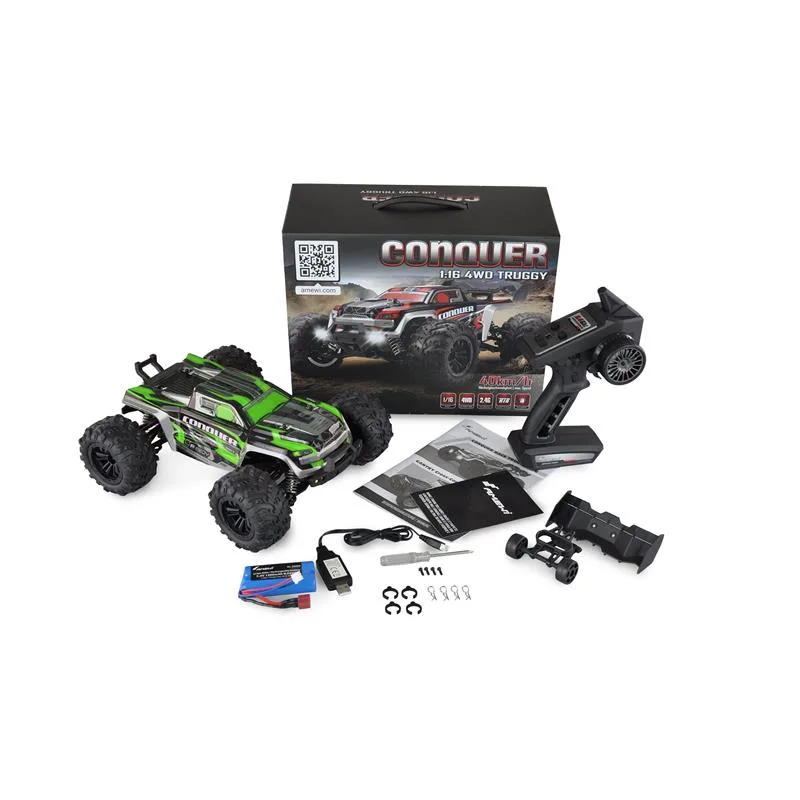 Im Maßstab 1:16 bringt der Conquer Truggy alles mit, das für großartige Action im Gelände benötigt wird: Metall-Kardanwellen und CVD-Antriebswellen vorne sorgen für direkte Kraftübertragung an die Räder. Dank 390er Racing-Brushed-Motor und Li-Ion Power sind Geschwindigkeiten von bis zu 40km/h möglich. Durch das Top-Deck aus Aluminium erhält das gesamte Modell mehr Festigkeit.