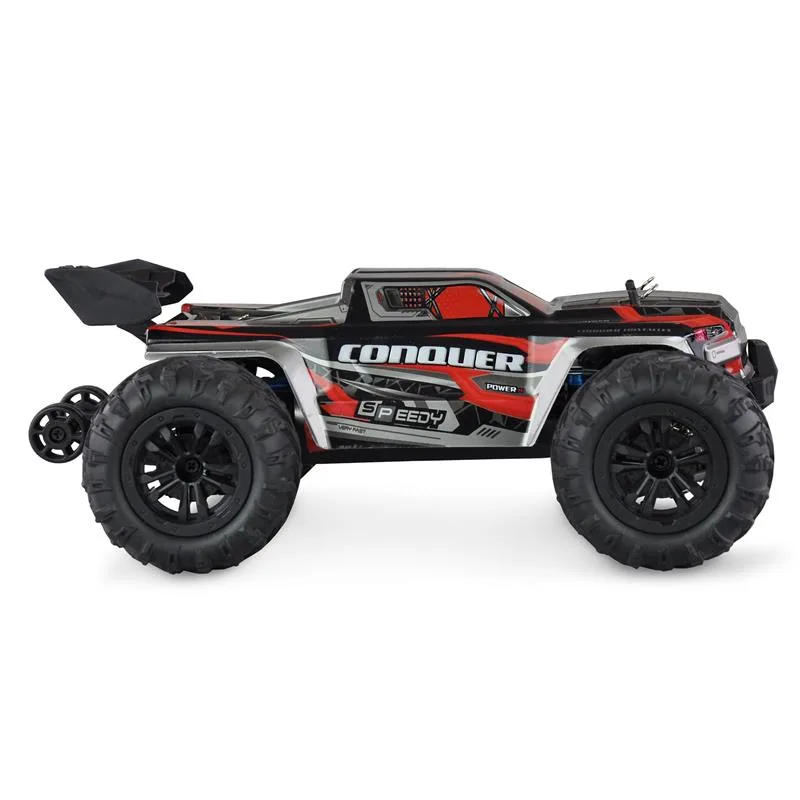 Im Maßstab 1:16 bringt der Conquer Truggy alles mit, das für großartige Action im Gelände benötigt wird: Metall-Kardanwellen und CVD-Antriebswellen vorne sorgen für direkte Kraftübertragung an die Räder. Dank 390er Racing-Brushed-Motor und Li-Ion Power sind Geschwindigkeiten von bis zu 40km/h möglich. Durch das Top-Deck aus Aluminium erhält das gesamte Modell mehr Festigkeit.