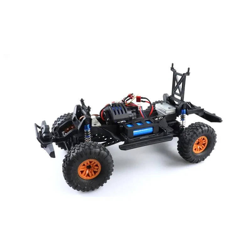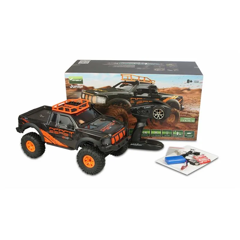 Coole Cross Country Optik trifft auf modernste Features. Dank kräftigem Motor, dem 4WD Allradantrieb und den Oversized-Reifen findet dieser Climbing SUV im Maßstab 1:10 immer seinen Weg aus der Wildnis. Bei Dämmerung hilft zusätzlich die helle LED-Beleuchtung, um jederzeit die Orientierung im Gelände zu wahren. Während die schwarz getönten Scheiben perfekt zum wilden Aussehen passen, lassen sich auf dem Dachgepäckträger dieses Crawlers zudem kleinere Dinge transportieren – ein großes Vergnügen für jeden RC-Piloten. Der Kunststoffrahmen des Fahrzeugs wurde so konzipiert, dass er wirkungsvoll Kollisionen abfedert. Kugellager aus Metall, eine vor Spritzwasser geschützte Elektronik und Stoßdämpfer mit echten Metallfedern unterstreichen den wertigen Eindruck des Modells. Durch eine gut in der Hand liegende und feinfühlige Pistolenfernsteuerung mit moderner 2,4GHz Funktechnologie ist gleichzeitig für eine störungssichere Fahrt gesorgt und auch der parallele Einsatz mehrerer Fahrzeuge aus dieser Serie kein Problem. Der Dirt Climbing Pick-Up wird RTR (Ready-to-Run) ausgeliefert, d.h. alle für den Betrieb benötigten Komponenten – selbst die Batterien für die Fernsteuerung – sind bereits im Lieferumfang enthalten.