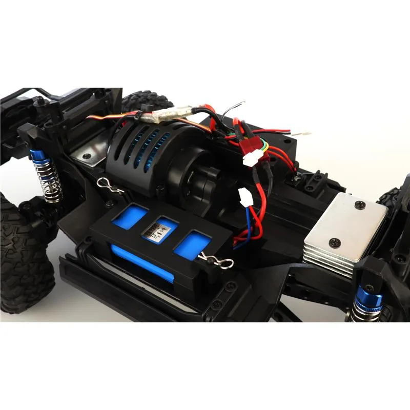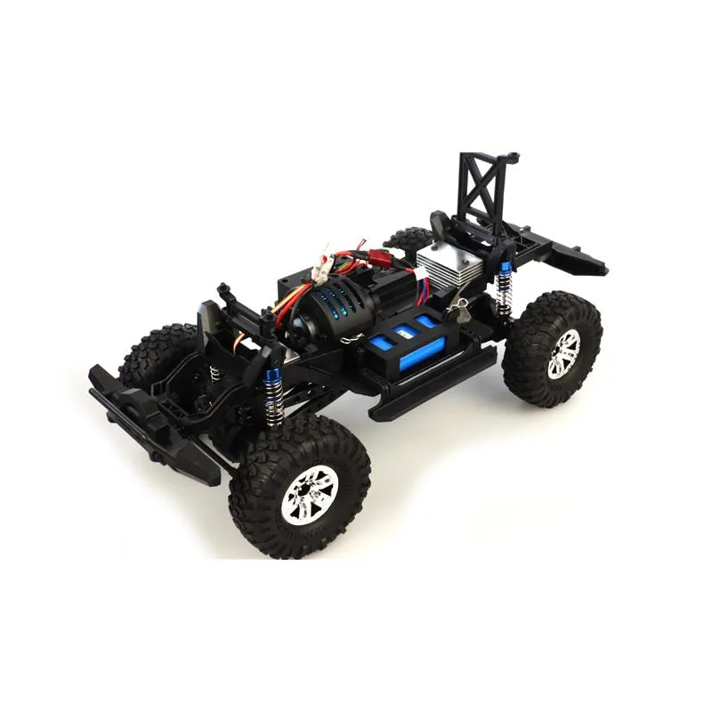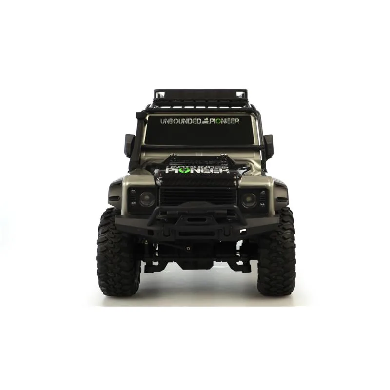 Coole Cross Country Optik trifft auf modernste Features. Durch den kräftigen Motor und den 4WD Allradantrieb mit den Oversized-Reifen findet der Pioneer SUV Crawler im Maßstab 1:10 immer aus einen Weg aus der Wildnis. Helle LEDs helfen bei der Orientierung. Auf dem Dachgepäckträger lassen sich kleine Dinge transportieren – ein Megaspaß für jeden RC-Piloten. Der Kunststoffrahmen wurde so konzipiert, dass er das Fahrzeug wirkungsvoll bei Kollisionen schützt. Kugellager aus Metall, eine vor Spritzwasser geschützte Elektronik, Stoßdämpfer mit echten Metallfedern, eine gut in der Hand liegende und feinfühlige Pistolenfernsteuerung mit moderner, störungssicherer 2,4GHz Funktechnologie unterstreichen den wertigen Eindruck des Modells. Der Pioneer SUV Crawler wird als RTR-Version (Ready-to-Tun) ausgeliefert – alle für den Betrieb benötigten Komponenten, selbst die Batterien für die Fernsteuerung, sind also bereits im Lieferumfang enthalten. Die schwarz getönten Scheiben passen zudem perfekt zur gesamten Optik dieses Crawlers.