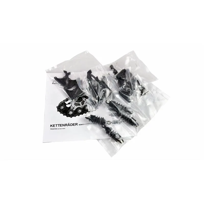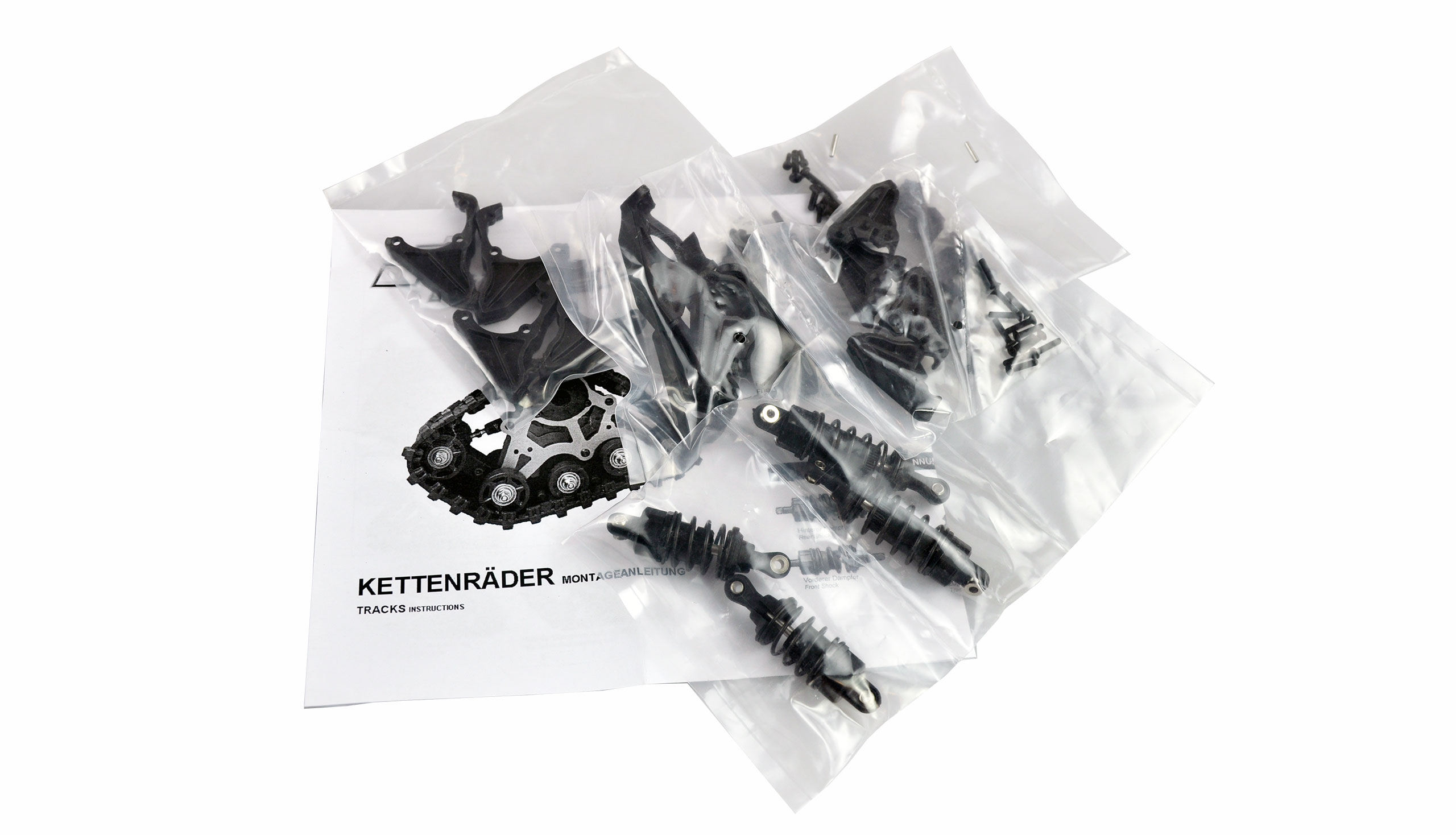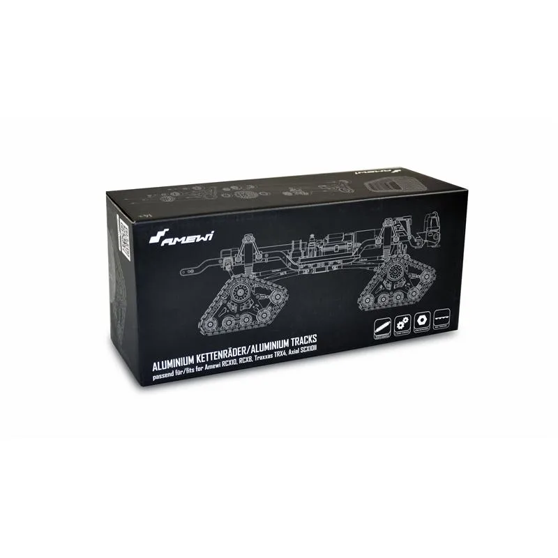 Hochwertiges Kettenfahrwerk für den Einsatz in unwegsamen Gelände wie z.B. Sand, Schnee und Matsch.Das gesamte Chassis des Fahrwerks wurde aus Metall gefertigt und mit insgesamt 64 Präzisionskugellager versehen. Die Antriebsräder sind mit Stahlwellen ausgestattet und die gesamte Laufeinheit ist versiegelt.Somit ist das Fahrwerk problemlos Allwettertauglich und die Kettenspannung ist über ein rechts / links Gewinde einstellbar. An der Innenseite des Fahrwerks wird ein hochwertiger Öldruckdämpfer als Verdrehschutz montiert, der das Fahrwerk zusätzlich präzise in der Spur hält. Dank des durchdachten Aufbaus kann dieses Fahrwerk problemlos auf jedem Untergrund und mit hoher Geschwindigkeit (z.B. im zweiten Gang unseres RCX Crawlers) gefahren werden. Dem Set liegen noch Adapter für z.B. TRX4 und SCX10 II bei, somit ist das Fahrwerk für unterschiedliche Fahrzeugtypen mit Portalachsen nutzbar.Technische Daten:Länge: 175mmBreite: 48mmHöhe: 102mmGewicht pro Stück: ca. 375gAufnahme: 12mmMaterial: Aluminium (Rahmen) / Gummi (Ketten)Lieferumfang:4x Kettenfahrwerk schwarz2x Öldruckdämpfer kurz vorne2x Öldruckdämpfer lang hinten4x Distanzhülsen4x Adapter für TRX44x Adapter für SCX10 II+4x Adapter für RCX8 und RCX104x 12mm Radmitnehmer in Aluminium, verschraubbarSchraubenset Aufbauanleitung DE / EN bebildert