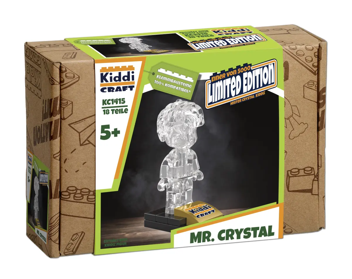 Es funkelt, es ist sinnlos – ich muss es haben. Diese auf 5.000 Stück limitierte KIDDIZ Figur ist komplett aus transclear Material gefertigt, so dass man die Innenkonstruktion der Figur von außen sehen kann. Beiliegend ist ein kleiner Displaystand mit aufgedrucktem Logo auf der Vorderseite und mattschwarzem Aufdruck der fortlaufenden Nummer. Dieses Set ist als Sammlerstück und Supporter-Set zur Weiterentwicklung der Marke Kiddicraft und insbesondere der KIDDIZ Figuren gedacht.