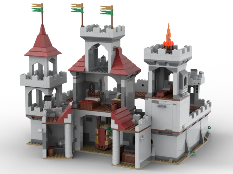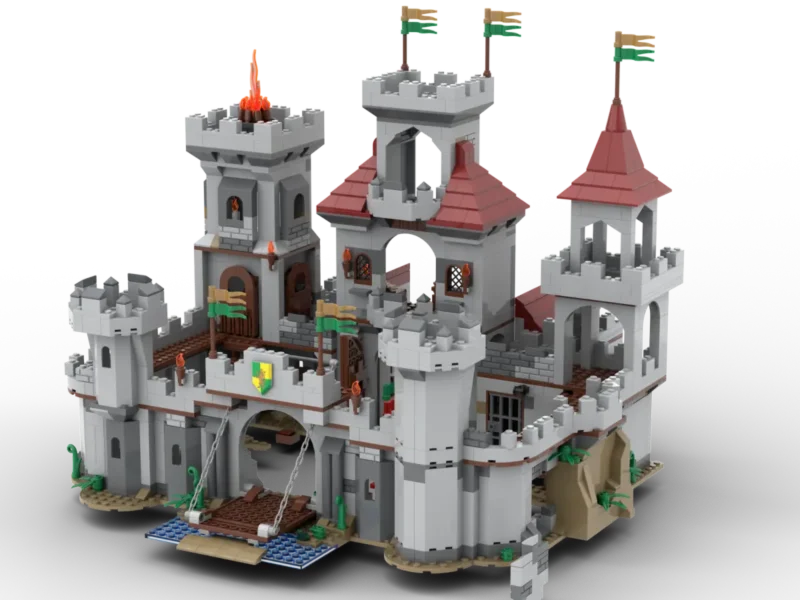 Camelot? Wer braucht Camelot? Selbst König Artus hätte sich so eine Burg gewünscht! Starke schützende Mauern, Zugbrücke, Schatzkammer im Burgfried, ein Stall für die Pferde – alles, was sich ein Burgbesitzer so wünscht! Die untere Etage des Haupthauses ist zur besseren Bespielbarkeit aufklappbar. Darin befinden sich Thronsaal, eine gemütliche Küche und die Waffenkammer. Damit die Orks auch eine Chance haben einzudringen, gibt es einen bespielbaren Mauerdurchbruch. Für die Unholde, die es in die Burg hinein geschafft haben, gibt es ein Verließ mit Falltür. Als optionales Erweiterungsset empfehlen wir den Ritter Außenposten (KC1505), dieser lässt sich passgenau in den Burginnenhof einsetzen. Damit der Spielspaß direkt starten kann sind drei Ritter, zwei Burgdamen, 1 Zwerg und zwei Orks sowie zwei Pferde im Set enthalten
