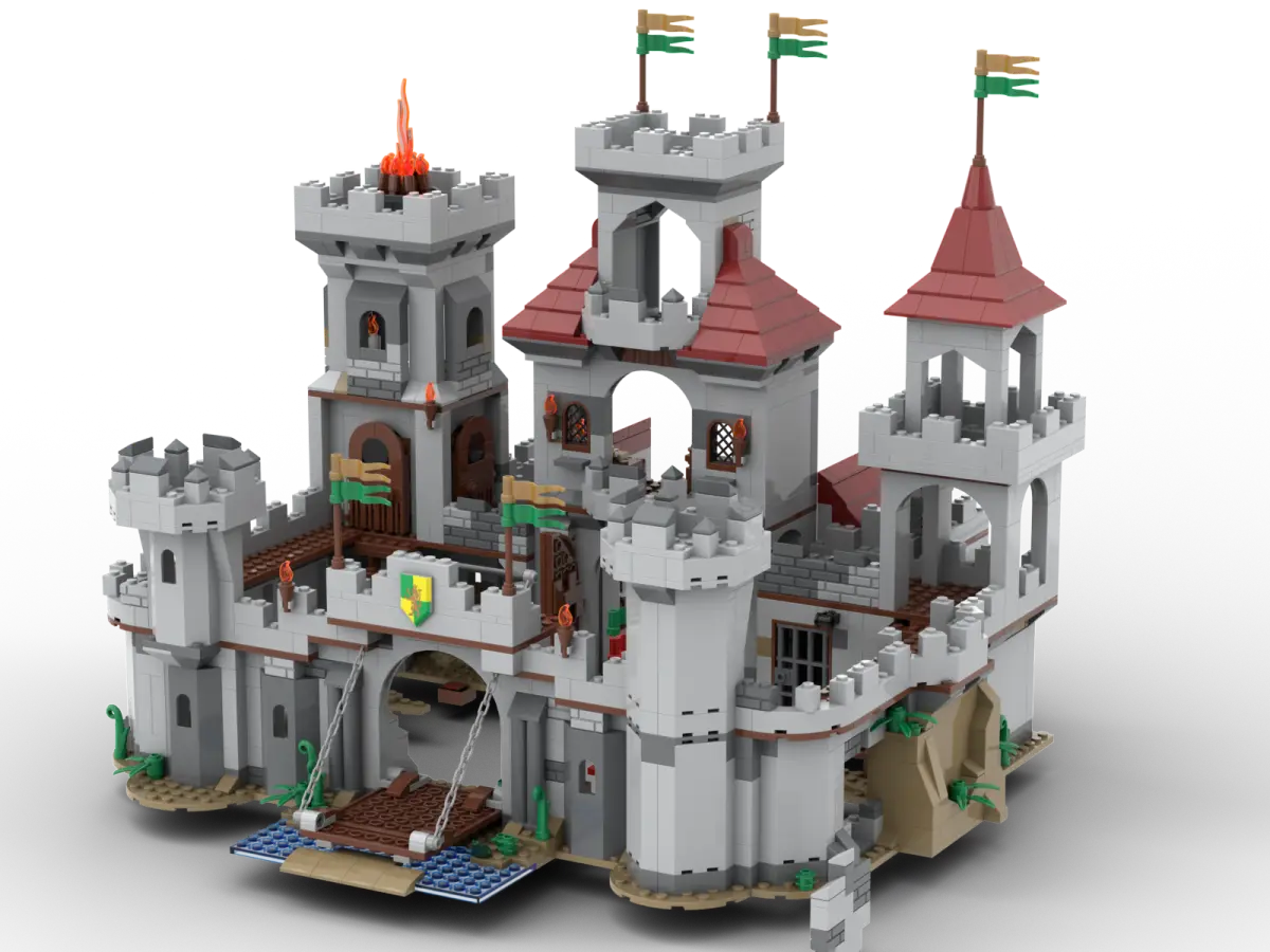 Camelot? Wer braucht Camelot? Selbst König Artus hätte sich so eine Burg gewünscht! Starke schützende Mauern, Zugbrücke, Schatzkammer im Burgfried, ein Stall für die Pferde – alles, was sich ein Burgbesitzer so wünscht! Die untere Etage des Haupthauses ist zur besseren Bespielbarkeit aufklappbar. Darin befinden sich Thronsaal, eine gemütliche Küche und die Waffenkammer. Damit die Orks auch eine Chance haben einzudringen, gibt es einen bespielbaren Mauerdurchbruch. Für die Unholde, die es in die Burg hinein geschafft haben, gibt es ein Verließ mit Falltür. Als optionales Erweiterungsset empfehlen wir den Ritter Außenposten (KC1505), dieser lässt sich passgenau in den Burginnenhof einsetzen. Damit der Spielspaß direkt starten kann sind drei Ritter, zwei Burgdamen, 1 Zwerg und zwei Orks sowie zwei Pferde im Set enthalten