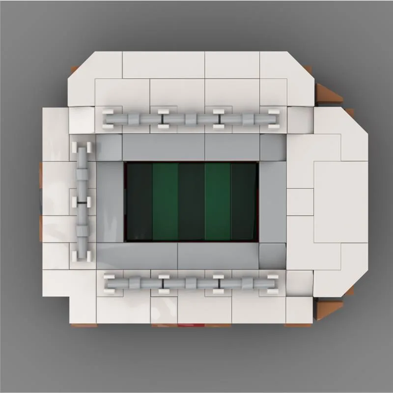 Liverpool Klemmbaustadion mit angedeuteten Details: Heimkurve, Gästebereich und ausgebaute Tribünen.