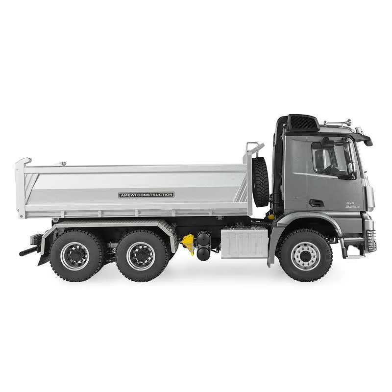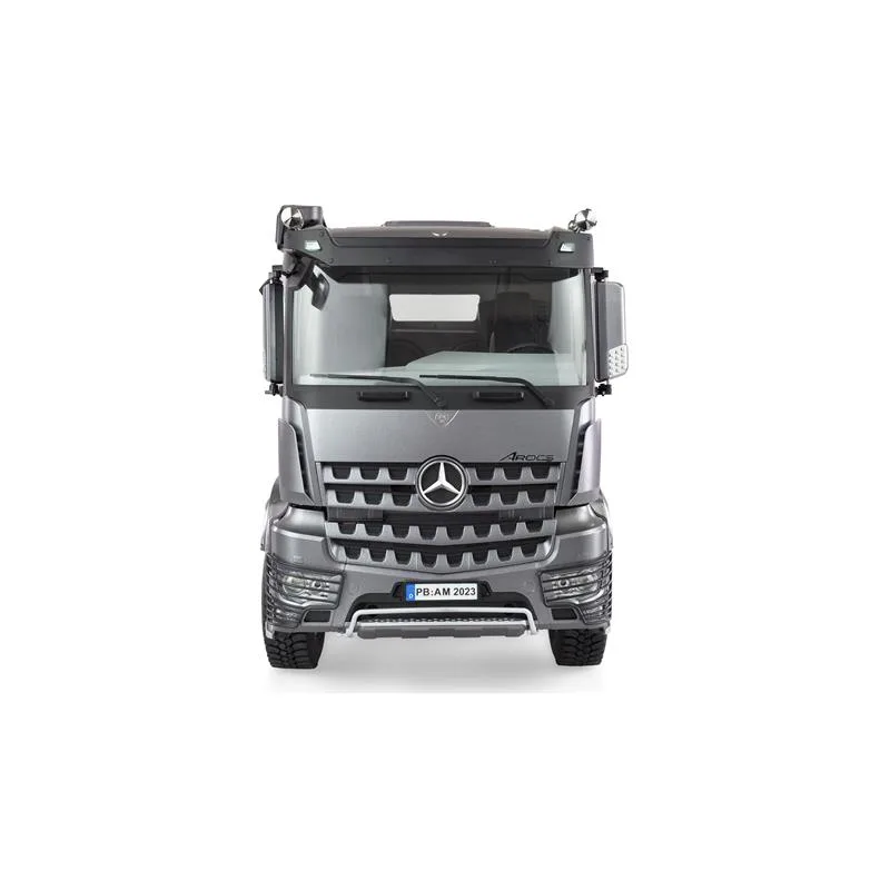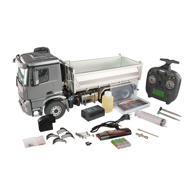 Exklusiver Lizenz-Lkw aus der Mercedes-Benz Arocs-Serie, der als 6×6 Modell mit hydraulisch betriebener Kippfunktion besticht und dank Scale-Optik im Maßstab 1:14 den Puls von Modellbauern höherschlagen lässt. Das Modell kommt voll ausgestattet aus einer hochwertigen Transportbox und beinhaltet ein Rundumsorglos-Paket: Dazu zählt das fertig aufgebaute Modell mit Soundmodul, Lichtsystem, 6×6 Antrieb, Differentialsperren, 2-Gang-Getriebe, 5000mAh 2S Li-Ion Akku, 2,4GHz Sendersystem (fertig programmiert) und Ladegerät. Ebenfalls im Lieferumfang enthalten sind diverse Anbauteile wie beispielsweise ein Scheinwerferschutz oder Signalhorn-Attrappen, Werkzeug sowie Hydraulik-Öl – und sogar die Batterien für den Sender sind dabei. Das Chassis, die Achsen, alle Antriebsteile und die Mulde sind aus Metall gefertigt. Die Kabine besteht aus hochwertigem Kunststoff inkl. Kabinenausbau. Die Felgen sind aus Aluminium gefertigt, die Reifen bestehen aus einer profilierten Gummimischung für maximale Traktion im Gelände. Als Stoßdämpfung dient hier für das gesamte Fahrwerk eine massive Blattfederung, die das Fahrverhalten des Modells sehr nahe an das Original heranbringt. Dank des Eigengewichts von 8,55 Kilogramm meistert der Arcos Hydraulik Muldenkipper Pro auch schwierigeres Gelände.