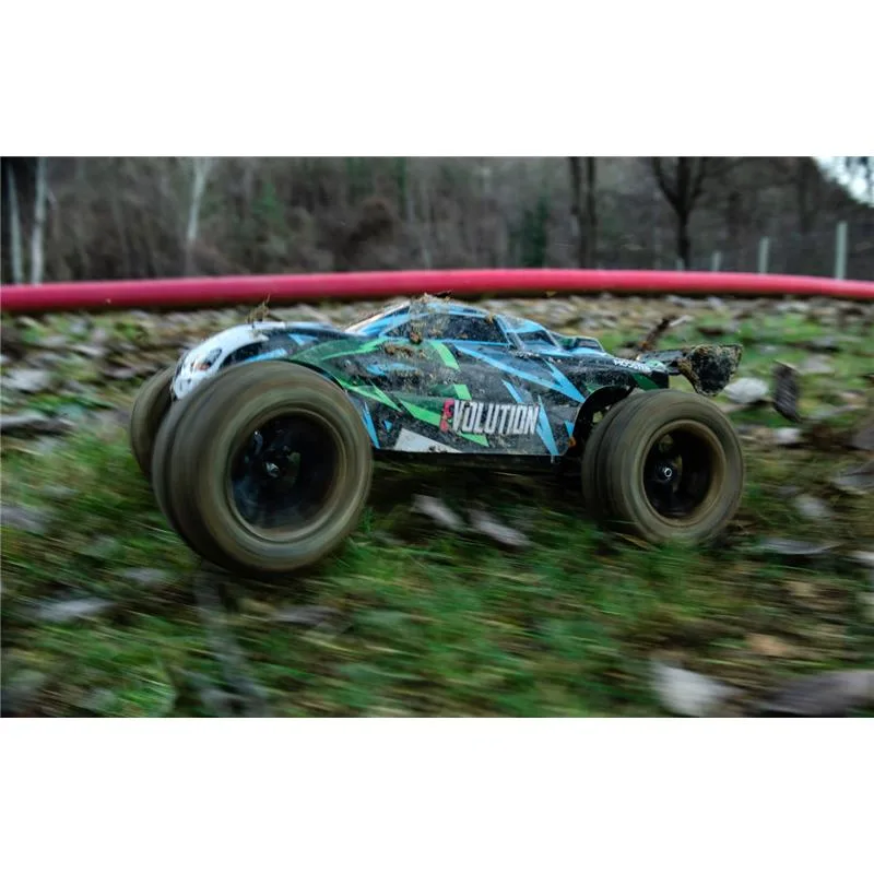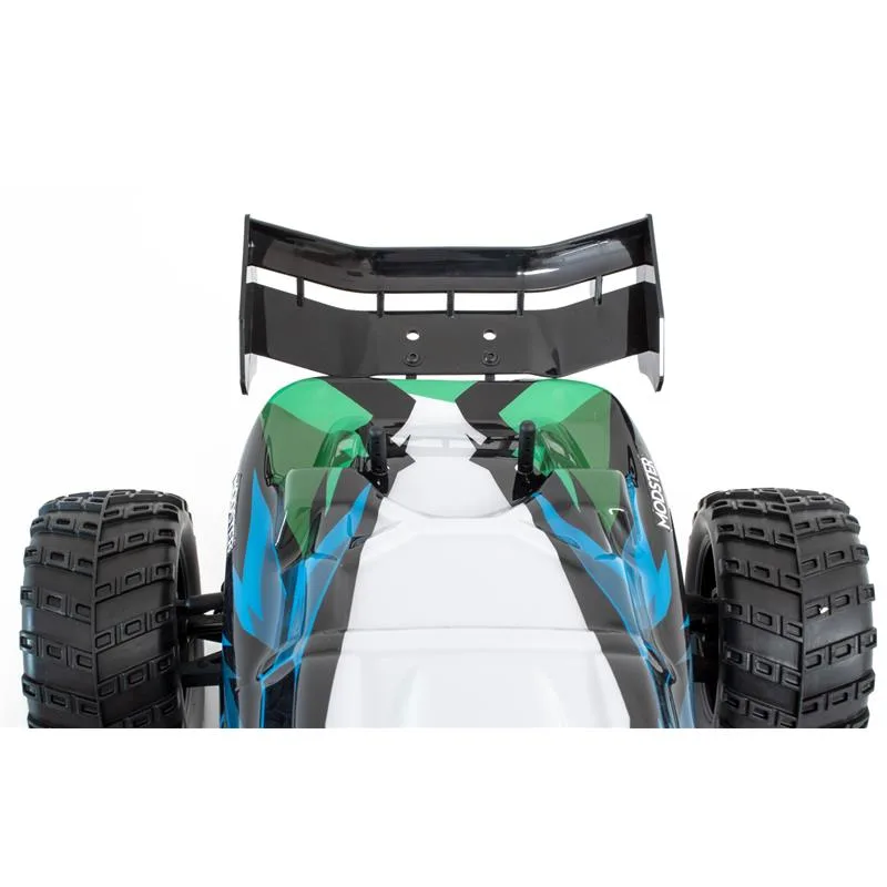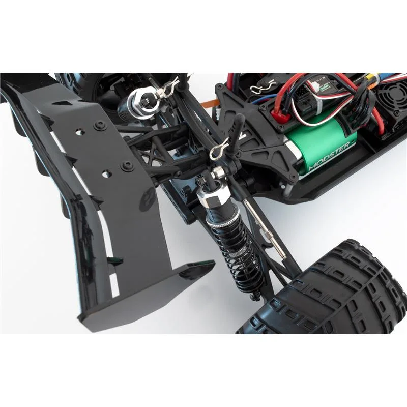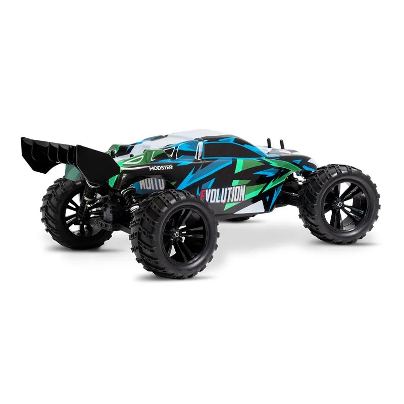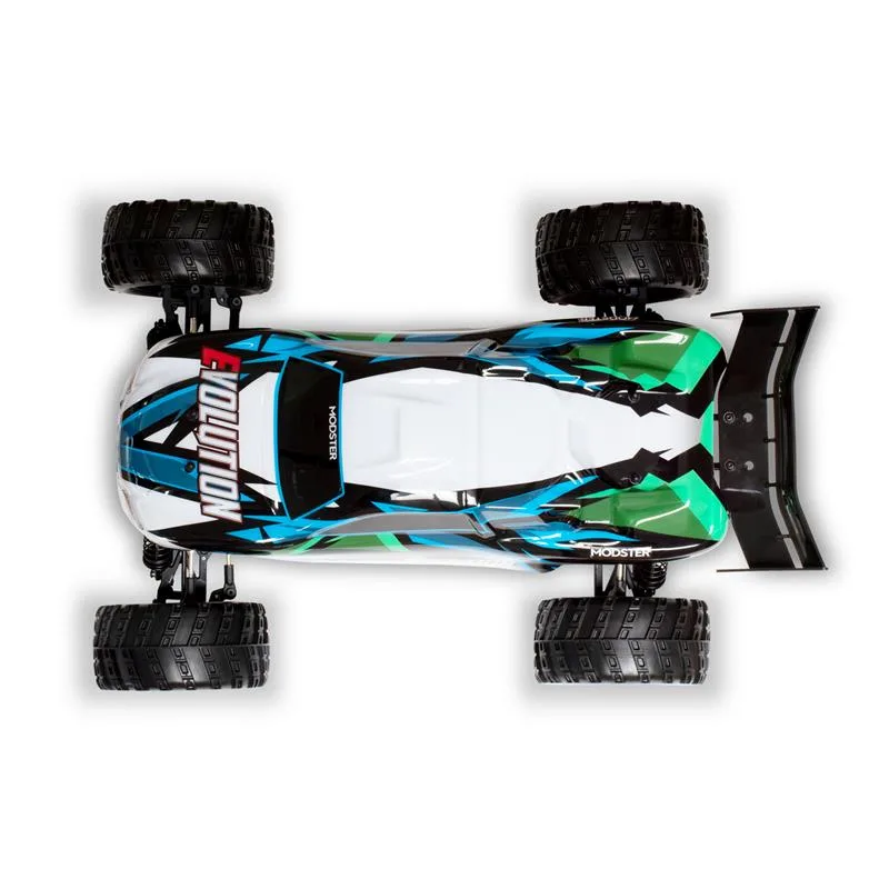 Unter der brandneuen, vorlackierten Beschichtung glänzt der MODSTER Evolution durch eine solide 4-Dämpfer Querlenker Aufhängung, einem stabilen Antriebsstrang und einem zuverlässigen 2,4GHz Funkfernsteuerungssystem. Aber auch die MT Wheels Reifen mit genialen Felgen in schwarz stechen ins Auge.