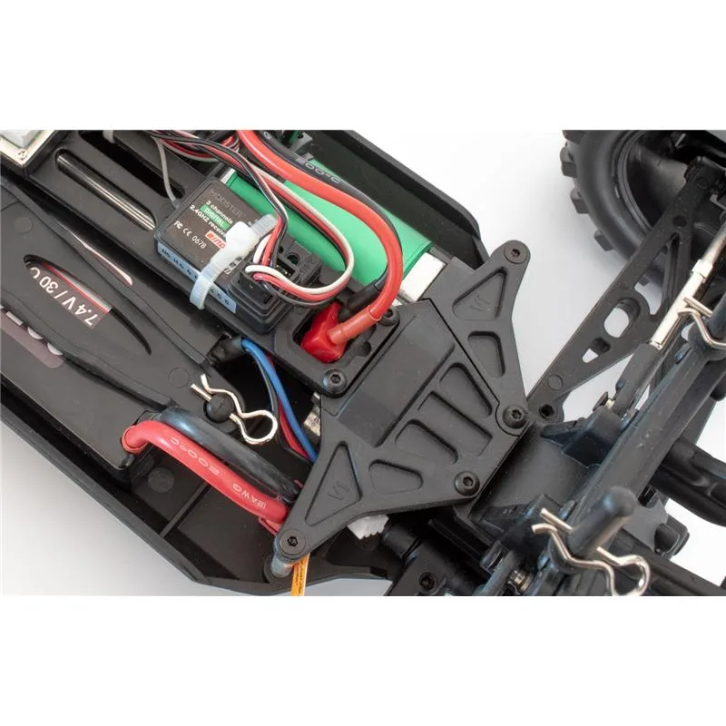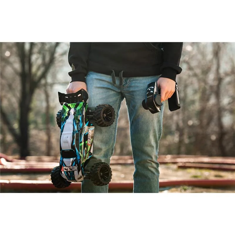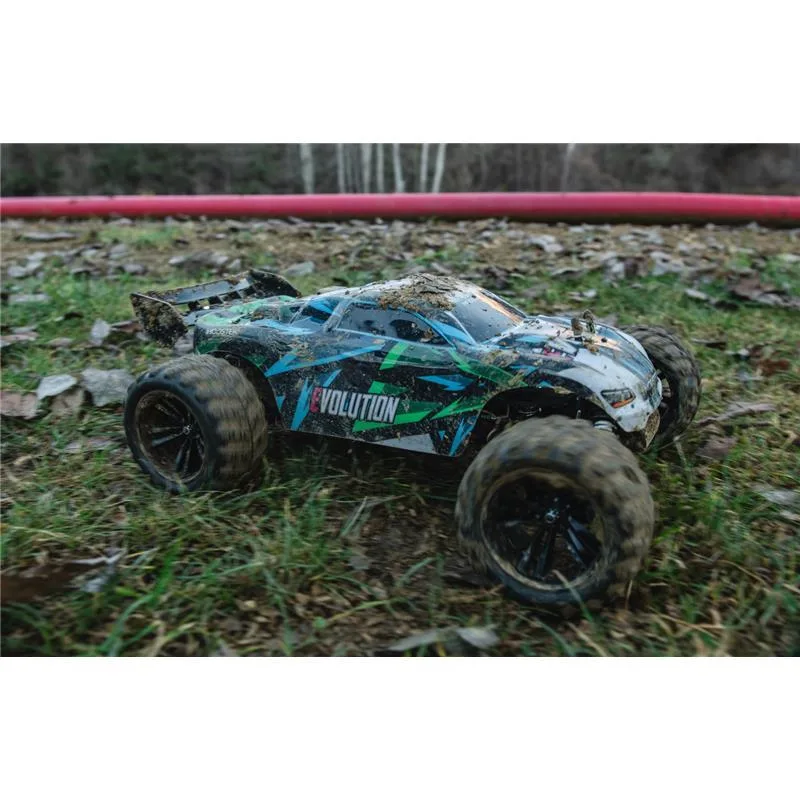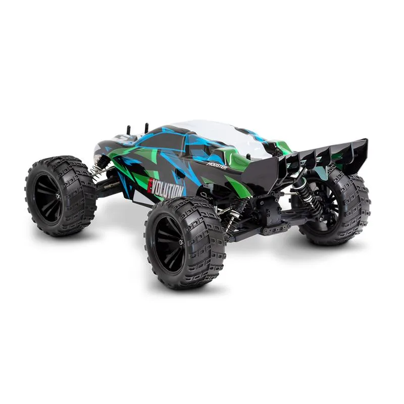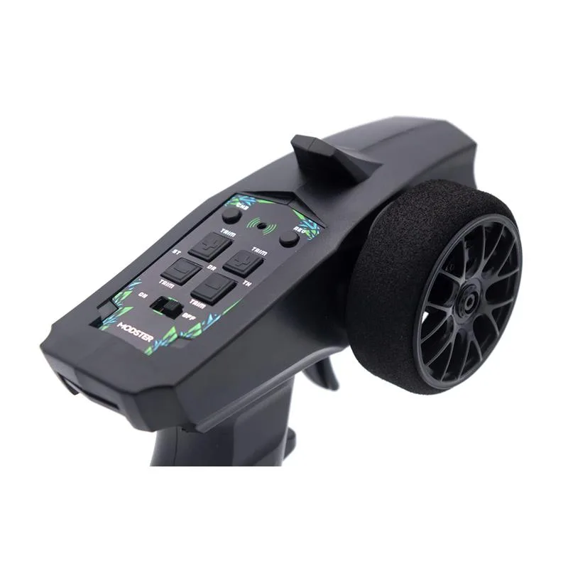 Unter der brandneuen, vorlackierten Beschichtung glänzt der MODSTER Evolution durch eine solide 4-Dämpfer Querlenker Aufhängung, einem stabilen Antriebsstrang und einem zuverlässigen 2,4GHz Funkfernsteuerungssystem. Aber auch die MT Wheels Reifen mit genialen Felgen in schwarz stechen ins Auge.
