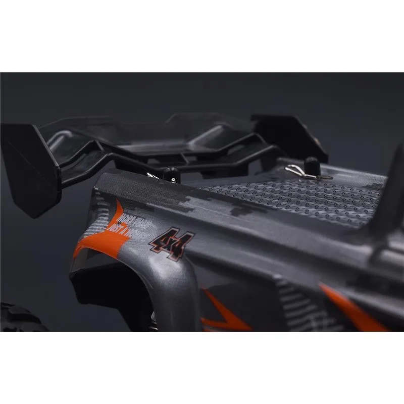 Das Chassis ist aus belastbarem, stabilem Kunststoff hergestellt. Auf Wunsch kann der Heckspoiler angeschraubt werden. Seine besonders auffallende Karosserie mit gedrucktem Design ist fertig an das Chassis angepasst und verfügt über einen Schnellverschluss mit 4 Splinten.