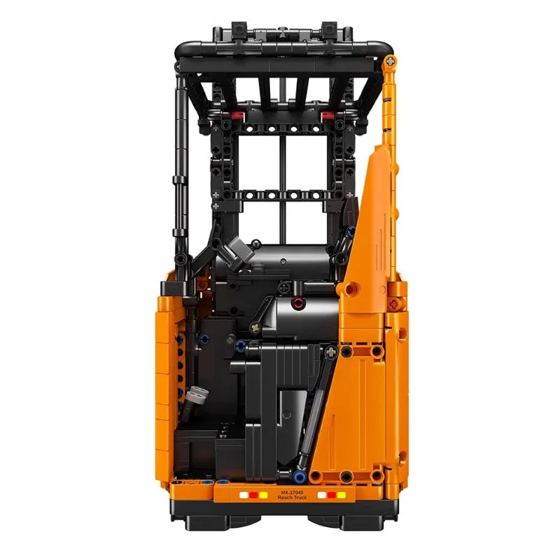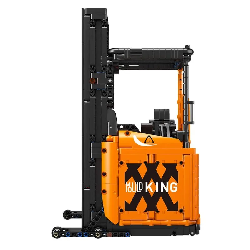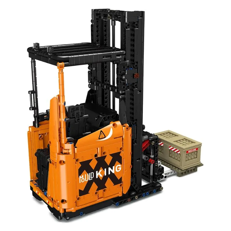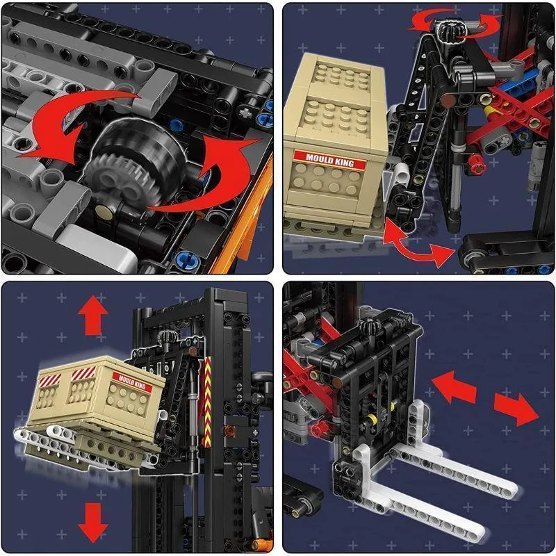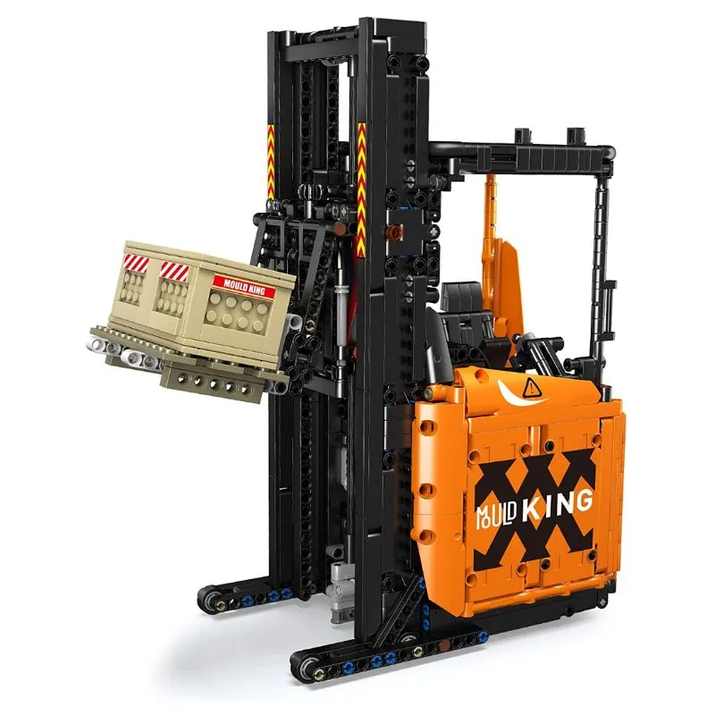 Der Mould King 17040 Gabelstapler orange kann wahlweise per mitgelieferter Fernsteuerung, der per App von Mould King ferngesteuert werden.