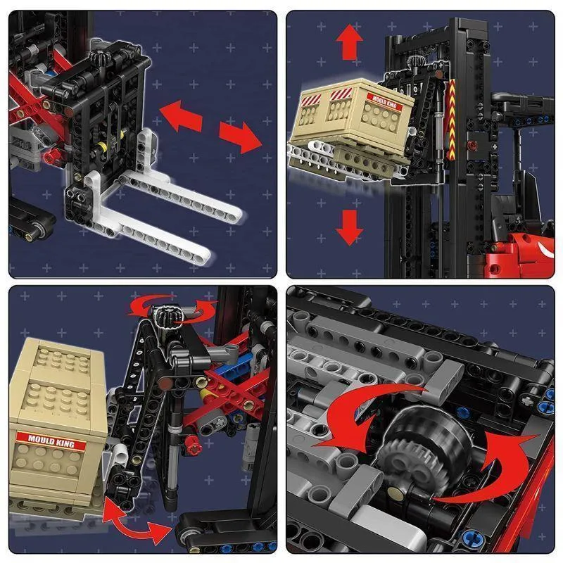 Der Mould King 17041 Gabelstapler rot kann wahlweise per mitgelieferter Fernsteuerung, der per App von Mould King ferngesteuert werden.
