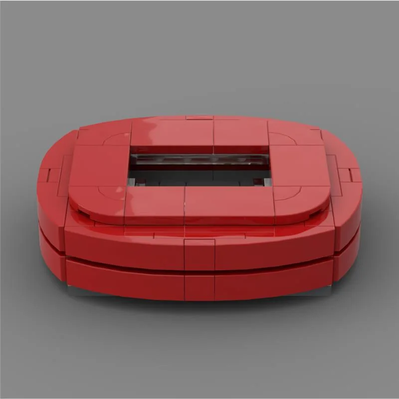 München Klemmbaustadion mit angedeuteten Details: Heimkurve, Gästebereich, weißer Werbeblock, Spielstand-Screens und Stadionbeleuchtung.