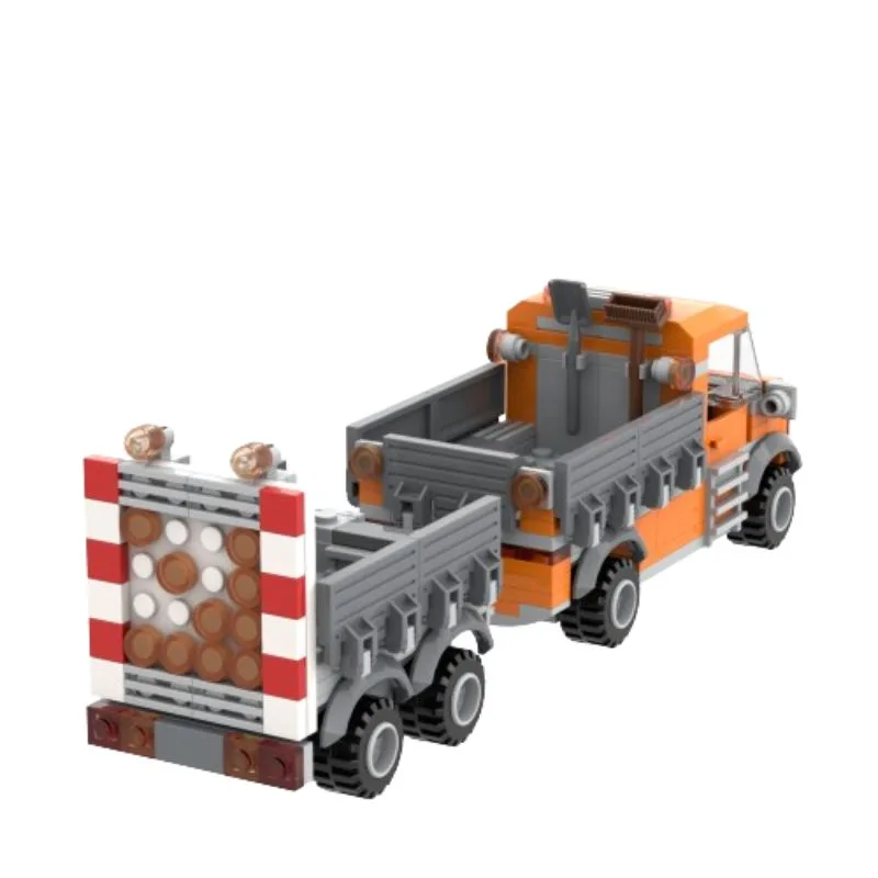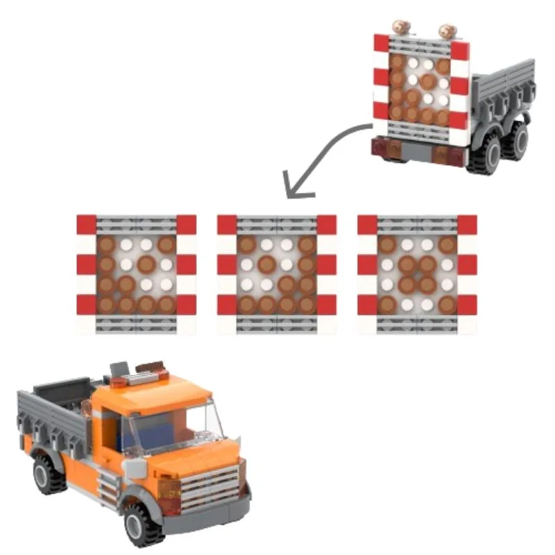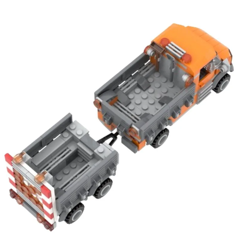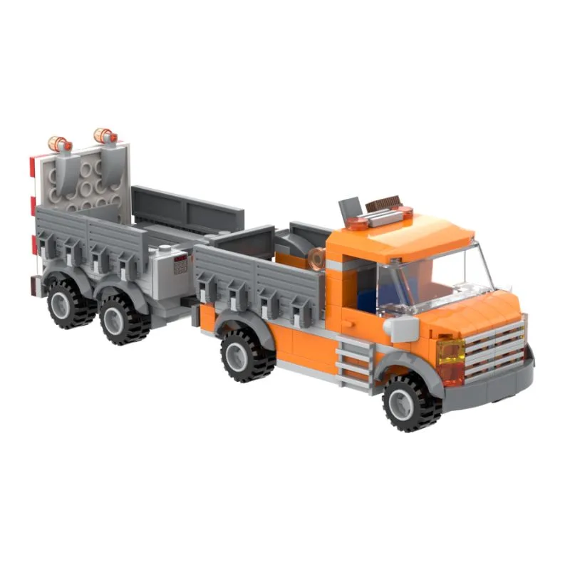 Sichere die Straßen Deiner Klemmbaustein-Stadt mit unserem Verkehrssicherungs-Fahrzeug mit Anhänger! Jede Menge Gelblichter und der Richtungspfeil des Anhängers warnen den nachfließenden Verkehr vor den Baustellenarbeiten.