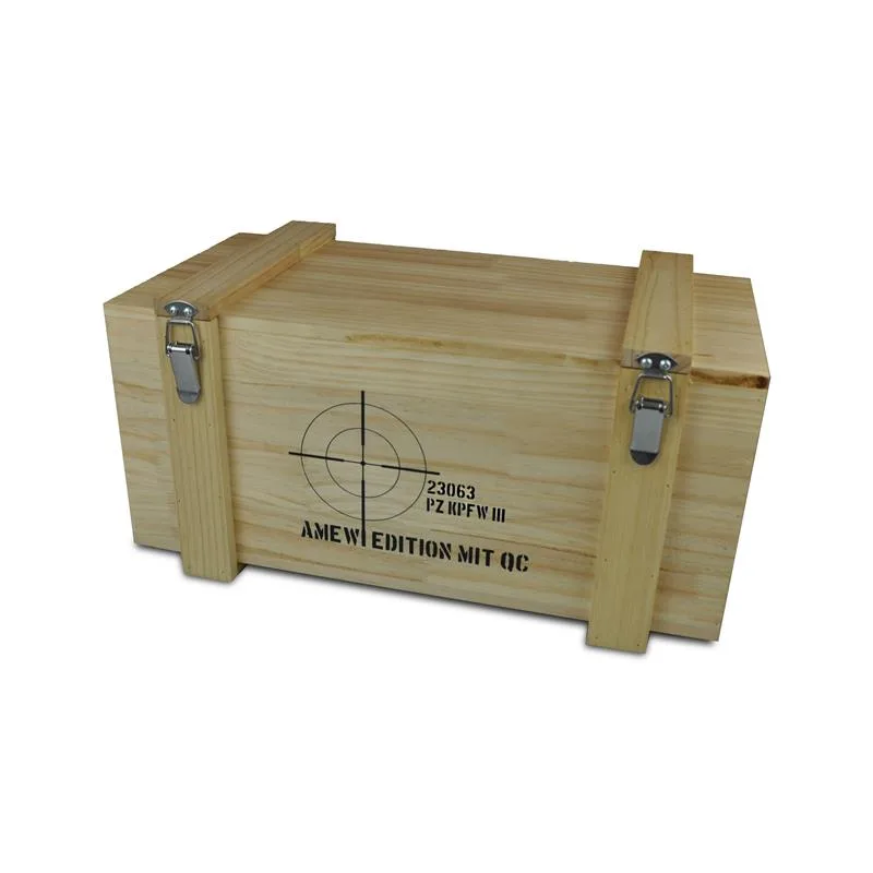 Die AMEWI Edition ist ein originalgetreuer Nachbau im Maßstab 1:16 und er wird als RTR – Ready-To-Run Version ausgeliefert. Im Lieferumfang ist alles für den Betrieb erforderliche Zubehör enthalten (außer Batterien für den Sender 6 x AA 1,5V Mignon). Der Panzer verfügt über eine Schuss, Rauch und Soundfunktion was den Scale Grad nochmal deutlich erhöht. In der aktuellen Version wurde zudem ein IR Kampfmodul nachgerüstet, um spannende Kämpfe mit anderen Modellen aus unserer Standard, Advanced oder Pro Linie Serie auszutragen. Ein Treffer wird dann durch ein „Schütteln des Modells simuliert. Als IR Schussfunktion dient dann das Bord MG. Die Hauptkanone verschießt zudem noch 6mm BB Kugeln bis zu 15m weit. Das hochwertige neu übersetzte und gekapselte Kunststoffgetriebe verteilt die Kraft des Antriebes (je ein Motor pro Seite) perfekt an die Ketten des Modells und das gesamte Fahrwerk ist gefedert und mit Schwingen versehen was das Fahrverhalten im Gelände optimiert. Die Lieferung des gesamten Modells erfolgt in einer hochwertigen Echtholzbox.