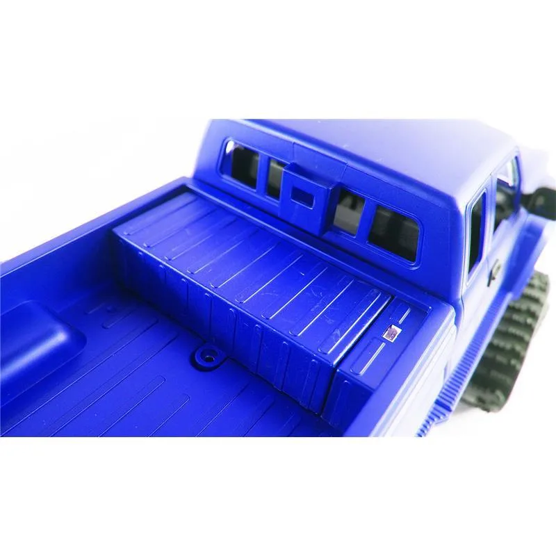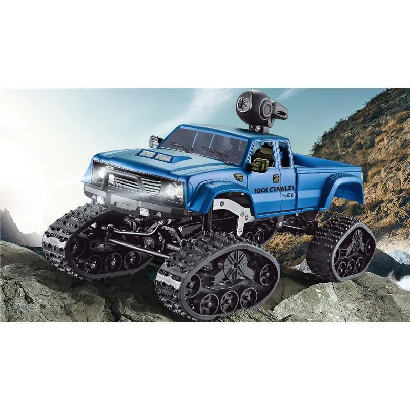 1:16 Pick-Up Truck blau mit Kettenfahrwerk, zusätzlichem Räderset und WiFi Cam inkl. Livebildübertragung auf Smartphones oder Tablets. Dieser tolle Truck mit seinen 34 cm Länge und dem starken Antrieb fühlt sich dank dem mitgelieferten Kettenfahrwerk und dem 4WD Antrieb im Gelände erst richtig wohl. Auch Schnee und Matsch stellen dieses Modell vor keine großen Herausforderungen. Die spritzwassergeschützte Elektronik und das 2,4Ghz Steuerungssystem sind weiter Highlights dieser Fahrzeugserie. Weitere Ausstattungsmerkmale sind z.B. ein Metallrahmen, hochwertige Verarbeitung und ein sehr schönes Fahrgefühl. Die mit gelieferte WiFi Cam ermöglicht dabei nicht nur Echzeit Livebilder sondern bietet auch die Möglichkeit Fotos oder Videos aufzunehmen. Somit bleibt jeder Ausritt ins unwegsame Gelände unvergeßlich.