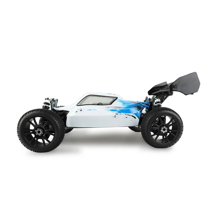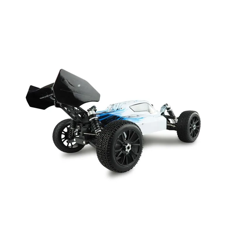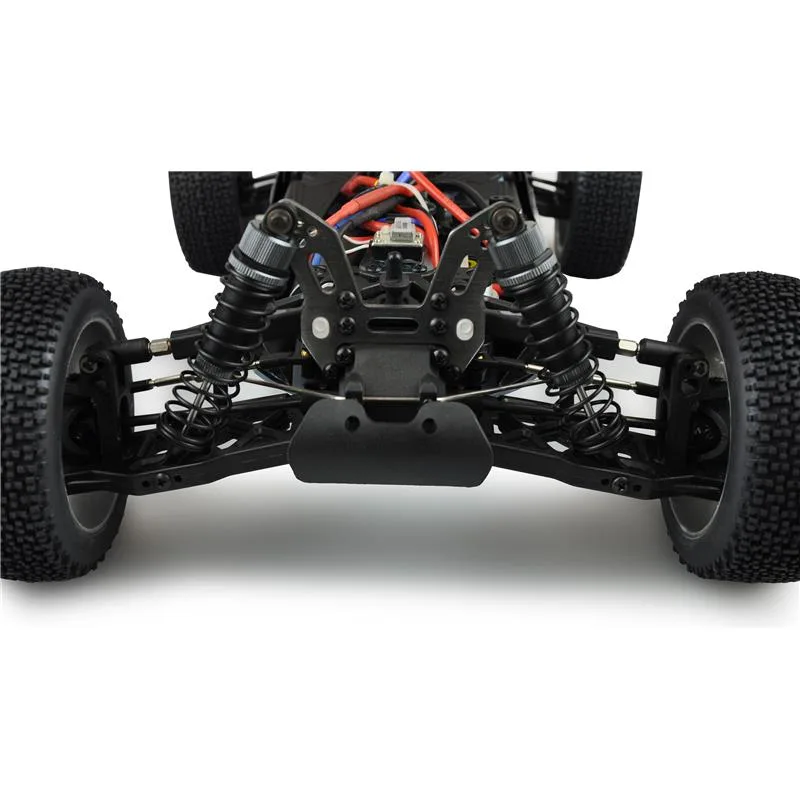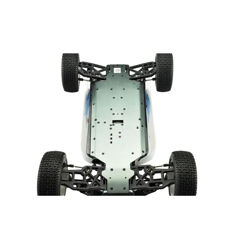 Planet Pro Buggy, 1:8, 4WD (Allrad), 2,4 GHz,RTR Dual LiPo Brushless Power vom Allerfeinsten. Dieser Buggy ist schnell. Richtig schnell. Der Planet pro Buggy wird durch einen brushless Motor in Kombination mit einem 80A Regler befeuert, auf denen jeweils ein Lüfter zur Kühlung sitzt. Das sorgt für eine lange Haltbarkeit dieser sensiblen Komponenten die ihre Power aus zwei fetten 3900mAh LiPo 2S Akkus bekommen. Fahrzeiten von knapp 30 min. sind mit dieser Combo problemlos möglich. Der Allradantrieb, der große Radstand,die hochwertigen Lenkservos und die perfekt auf das Auto abgestimmte Bereifung lassen den Buggy spursicher und radikal durch das Gelände schießen.Das Motorritzel und auch das Hauptzahnrad sind aus Stahl. Das Chassis aus Aluminium und der hochgezogene Flankenschutz geben zusätzliche Sicherheit bei wilden und harten Ausritten. Die Pistolen Fernsteuerung mit störungssicherer 2,4 GHz Technologie liegt gut ausbalanciert in der Hand und lässt sich feinfühlig bedienen. Die Elektronik ist spritzwassergeschützt, die Alu-Öldruckstoßdämpfer sind wie das Fahrwerk einstellbar. Das Chassis ist extrem robust, die Karosse besteht aus schlagzähem Polycarbonat.