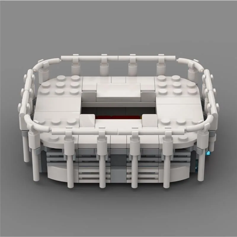Stuttgart Klemmbaustadion mit angedeuteten Details: Heimkurve, Gästebereich, Spielstand-Screens, Stadionbeleuchtung und Dachkonstruktion.